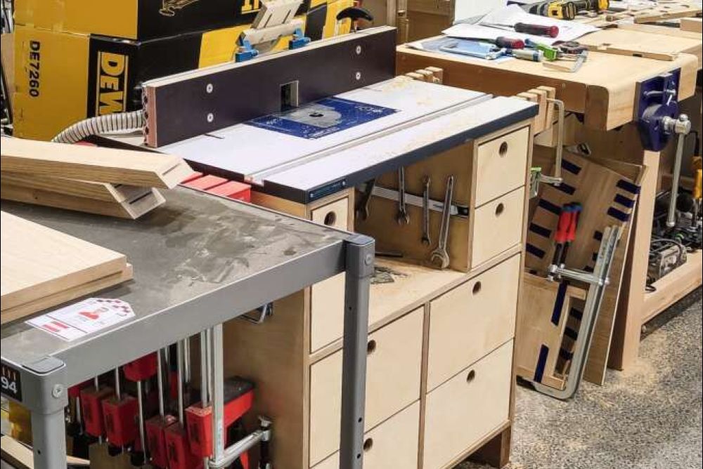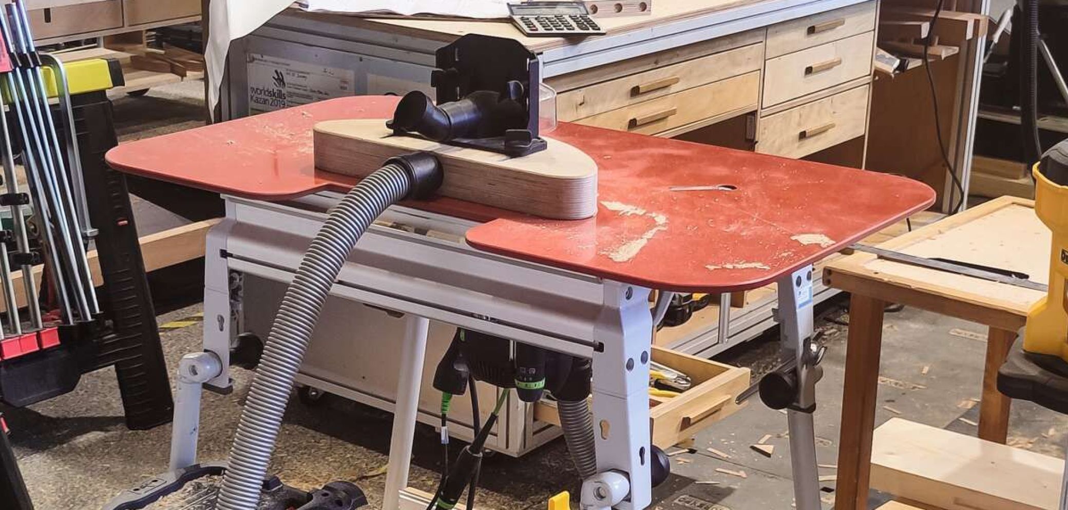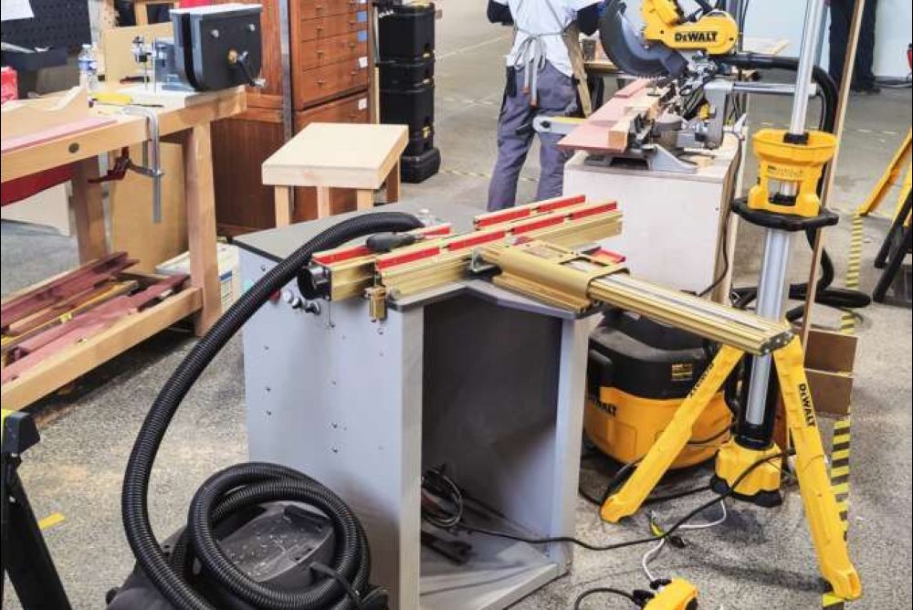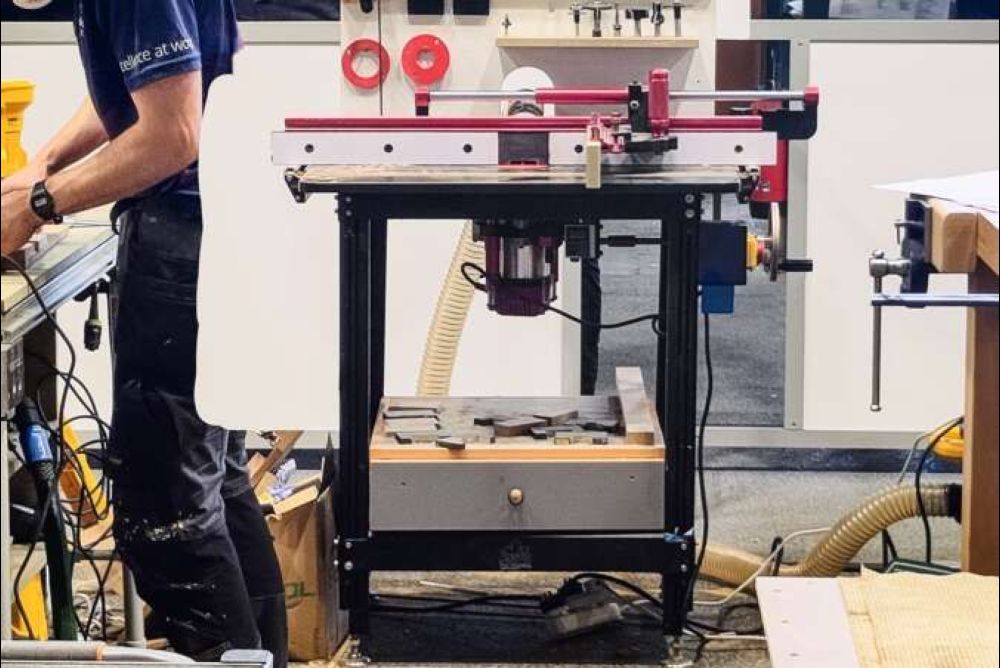 Wie hochwertig oder wie umfangreich die Fräserschubladen oder die Tischoberfräsen an sich ausgestattet waren, variierte zuweilen von Kandidat zu Kandidat stark. Generell ist das Budget für Werkzeug und Maschinen von Nation zu Nation jeweils sehr unterschiedlich, was sich logischerweise auch bei den Tischoberfräsen widerspiegelt. So präsentierte sich die Maschine in Lyon bei manchem Kandidaten etwa als einfacher Eigenbau aus Plattenwerkstoffen, oder es diente anstelle eines teuren Oberfräsenliftes ein Scherenwagenheber zur Höhenverstellung des Fräsers. Auf der anderen Seite sah man auch das eine oder andere Komplettset, das je nach Ausstattung wohl mit mehreren Tausend Franken, Euro oder Dollar zu Buche geschlagen hat.