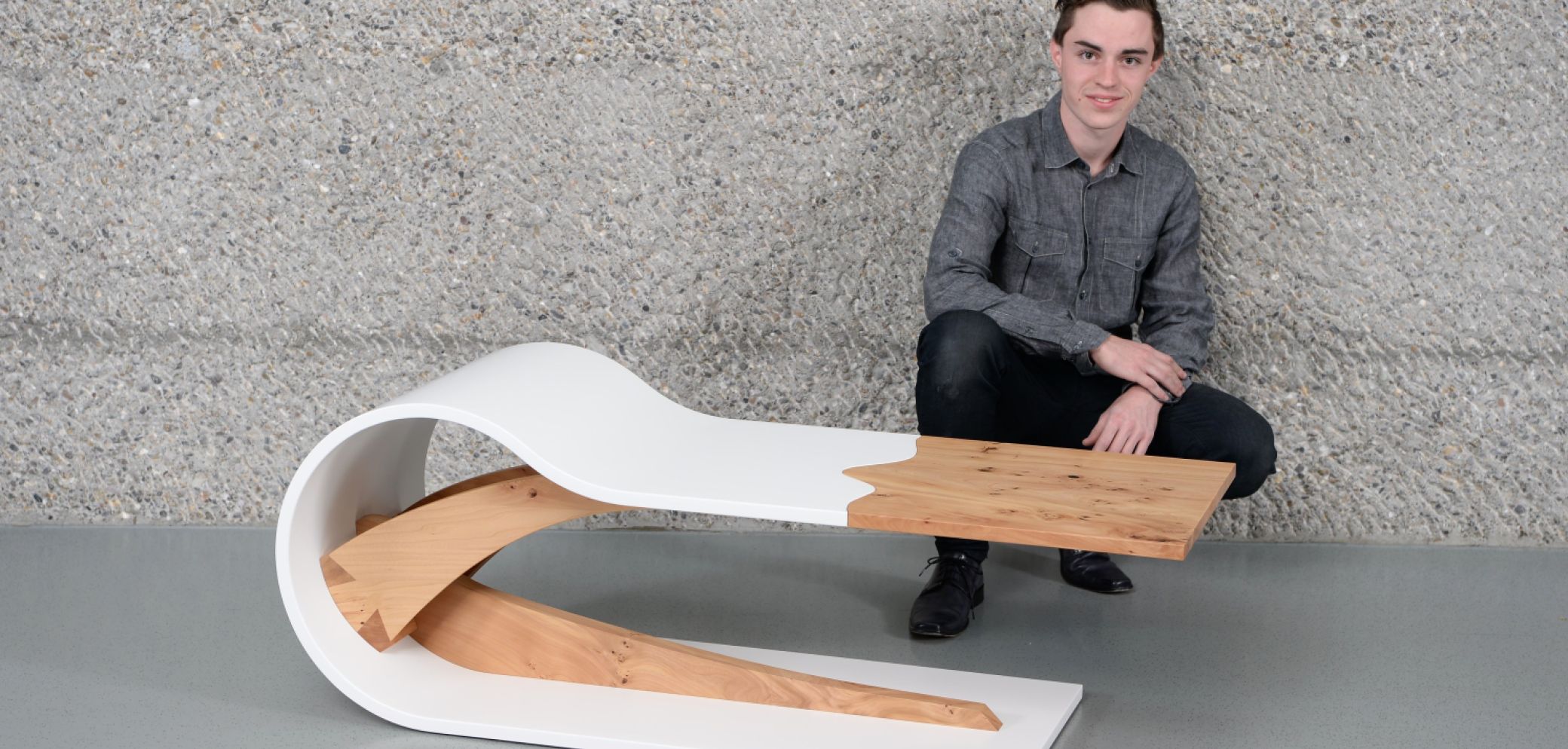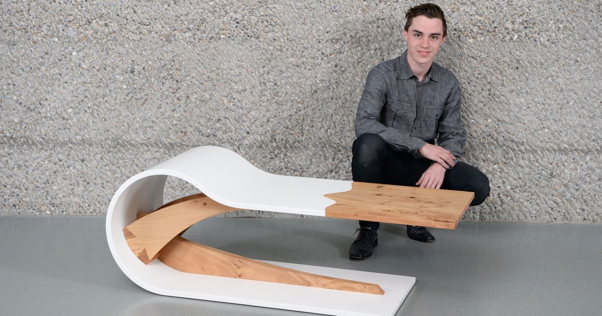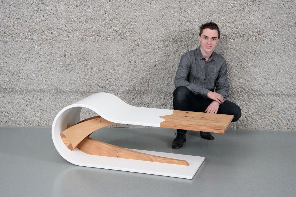 1. Preis «Fachjury»: Flavio Zehnder (Hugentobler AG, Braunau) mit seinen «Curved Table». Bild: Verband Schreiner Thurgau VSSM