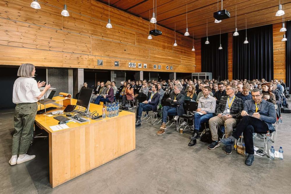Architektin Christine Wüthrich stellt dem Publikum die Umnutzung des Galenica-Gebäudes bei Bern vor. Bild: Nicolas Bianchi (BFH Biel)