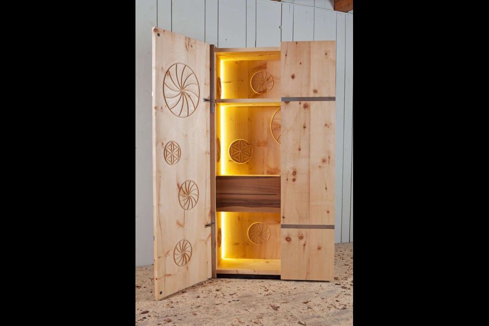 Einer, der sich schon lange mit individuellen Beschlägen beschäftigt, ist Schreiner Ramon Zangger aus dem Oberengadiner Samedan. Seine beiden unterschiedlichen Modelle von Schranktürbändern erfüllen auch konstruktive Aufgaben und haben gestalterische Wirkung. Frontseitig sichtbar, aus acht Millimeter starkem Chromnickelstahl gefertigt und eingegratet in das Massivholz, ermöglichen sie eine Öffnung der Türen um 270°. Der Drehpunkt ist dabei weiter nach aussen gerückt als üblich, was dem Benutzer ein erhabenes Gefühl beim Bedienen gibt. «Als Schreiner willst du die Tür oder die Klappe so öffnen können, wie du es dir vorstellst. Der Drehpunkt bestimmt dabei alles: Was das Holz alles darf und was das Metall können muss», sagt Ramon Zangger. Heute muss ein Beschlag oft in allen erdenklichen Richtungen eingestellt werden können, auch damit Ungenauigkeiten möglichst schnell gerichtet werden können. Es geht dabei um Zeit und Geld. Beim Beschlag von Zangger ist das natürlich anders: Dieser wird präzise ins Holz gesetzt und kann nicht verstellt werden. Dafür sind am Band keine Schrauben sichtbar, weil der Beschlag formschlüssig im Holz sitzt.