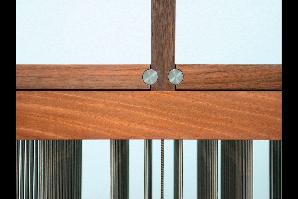 Viel Erfahrung mit Beschlägen und Metallelementen hat die Thut Möbel AG in Buchs ZH gesammelt: Dort sind die Entwürfe oft mit filigranen Metallteilen und Mechanismen versehen. Für den Dreh-Klapp-Tisch wurde eigens ein Alu-Kunststoff-Scharnier mit zwei Achsen entwickelt und bildet so zusammen mit dem Drehmechanismus der Platte das «Herzstück» des Möbelentwurfes. Denn durch das widerstandslose Auf- und Zuklappen der Eckplatten und dem Verdrehen der Tischplatte vergrössert sich die Tischplatte und bietet so Platz für bis zu acht Personen. Auch bei der Schreinerei Nut und Grat in Visp VS hat man sich vor einigen Jahren daran gemacht, einen eigenen Vollauszug zu kreieren. Das Besondere der Eigenentwicklung ist aus gestalterischer Sicht dessen Sichtbarkeit in der Front in Form eines Punktes aus Edelstahl.