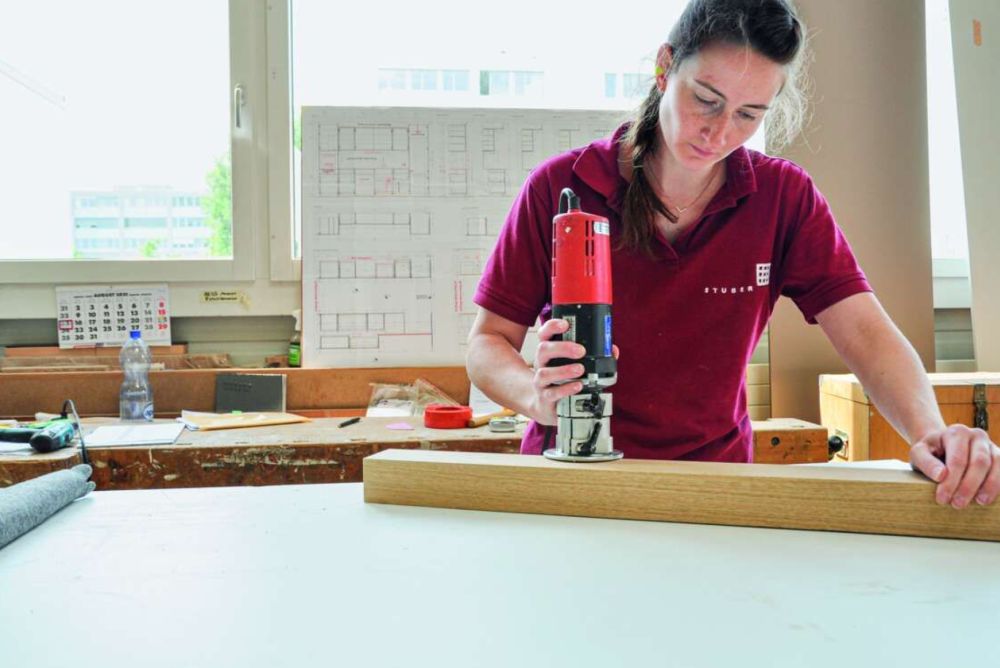 Corina Odermatt hat mit 25 Jahren eine Zweitausbildung zur Schreinerin gemacht. Zuvor hatte sie mehrere Jahre in verschiedenen Büros gearbeitet, war aber nie so richtig glücklich geworden damit. Bei der Stuber Team AG in Rotkreuz ZG hat sie ihr Glück gefunden. Sie geniesst die Arbeit mit dem Werkstoff Holz und freut sich, wenn sie am Abend sehen kann, was sie während des Tages geleistet hat.