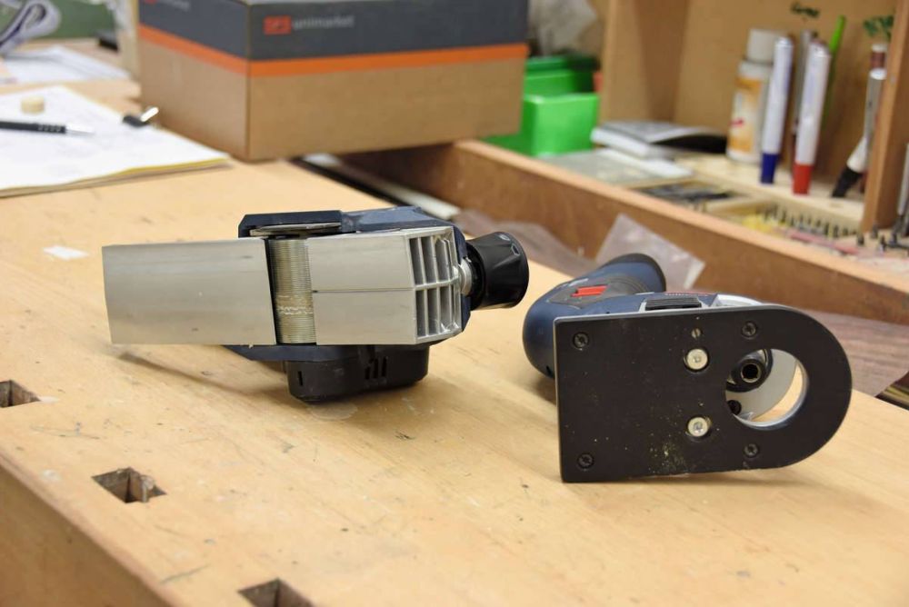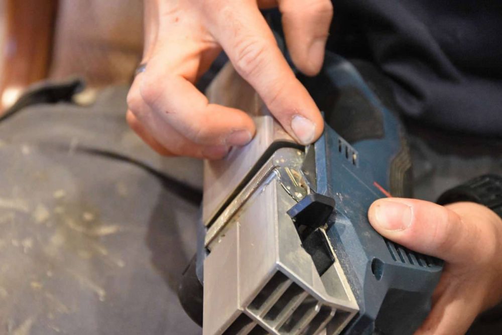 Dafür liegt die Fräse gemäss den Schreinern sehr gut in der Hand. Auch der Ein-/Aus-Schalter ist gut positioniert und so eingelassen, dass man ihn nicht versehentlich betätigt. «Ganz toll ist, dass man beim Fräsen nicht ständig auf ein Kabel achten muss.» Auch die Tiefenverstellung mit Feinjustierung funktioniert einwandfrei und präzise.