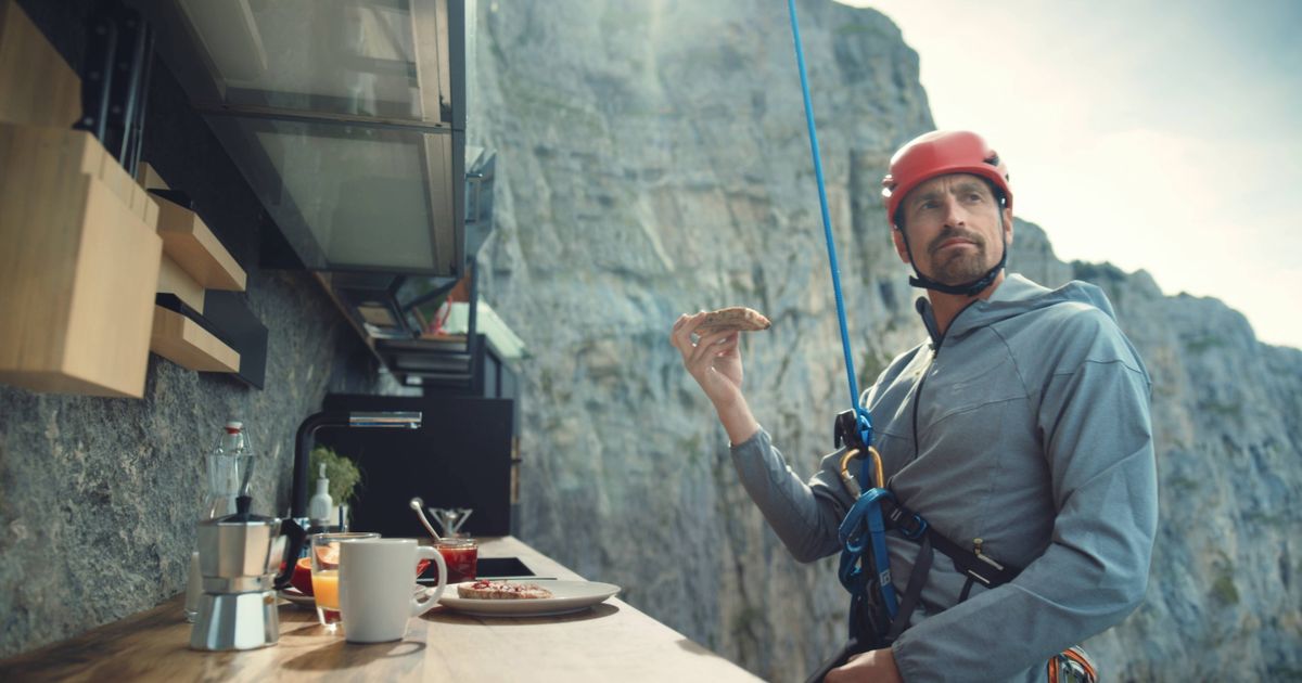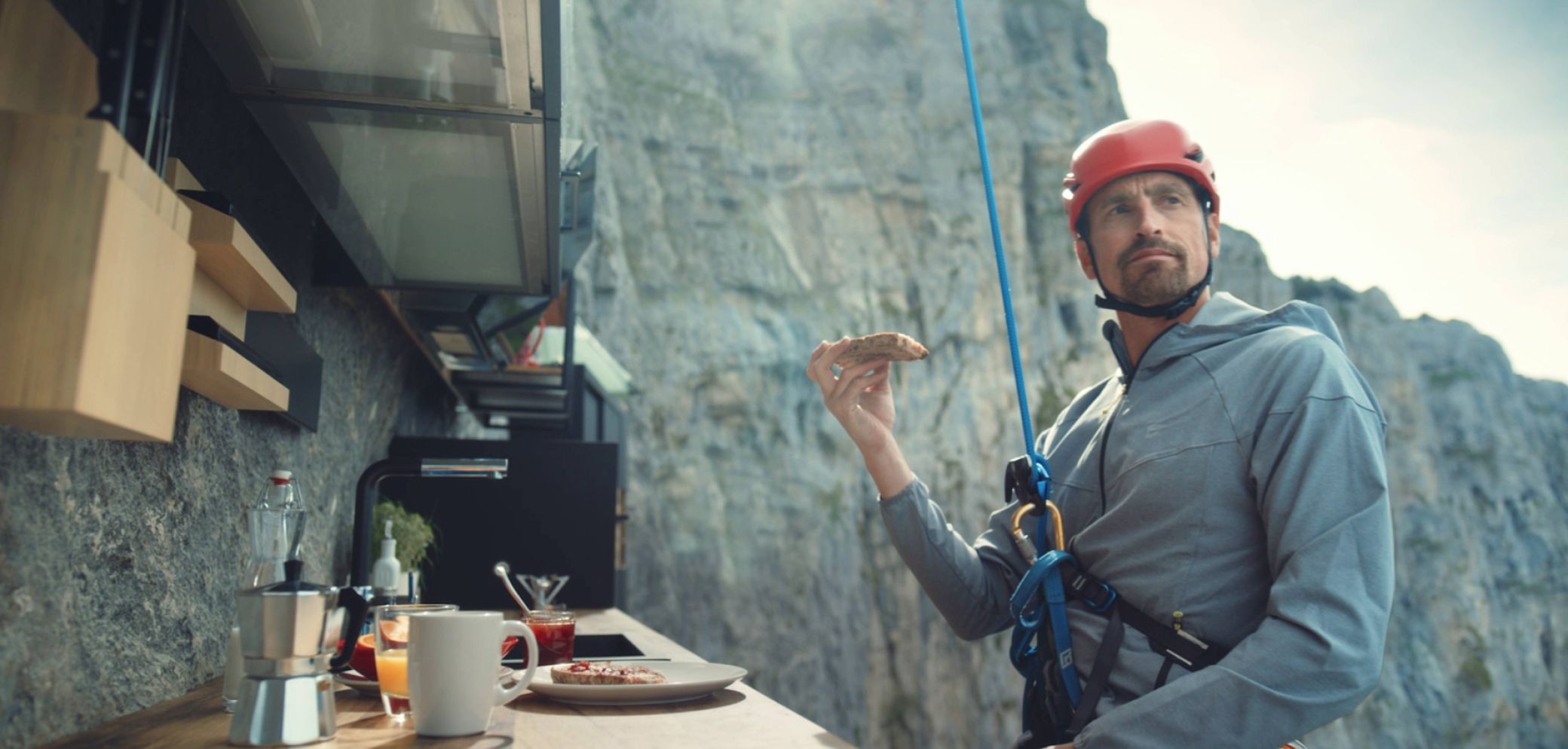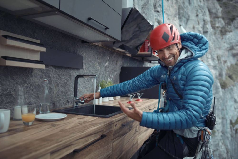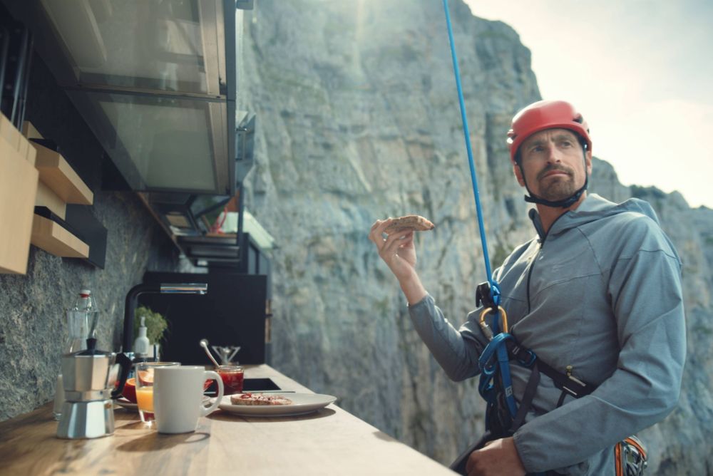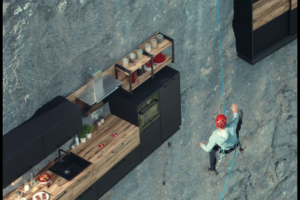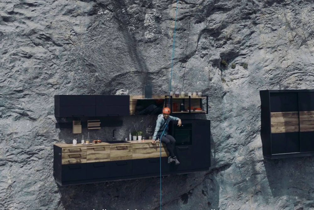 In einer spektakulären Werbeaktion zeigt nun Europas fünftgrösster Küchenhersteller, dass er selbst die ausgefallensten Kundenwünsche realisieren kann. Dafür hat das Team von Schmidt Küchen kurzerhand für den britischen Alpinisten und Bergführer Kenton Cool eine Küche samt Ankleide kreiert und diese, nicht wie üblich in eine Wohnung gestellt, sondern an eine Felswand gehängt.