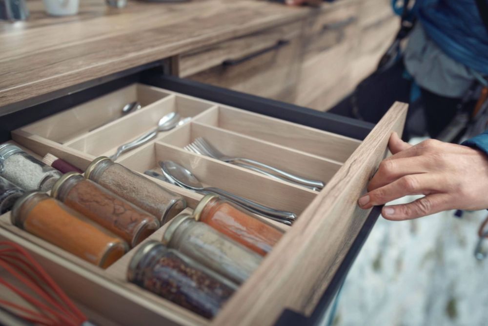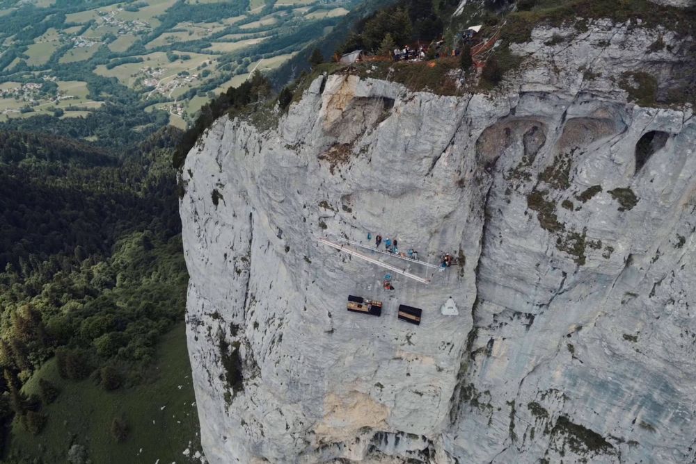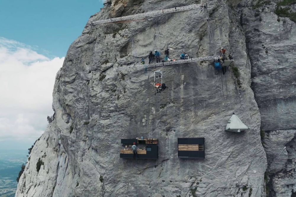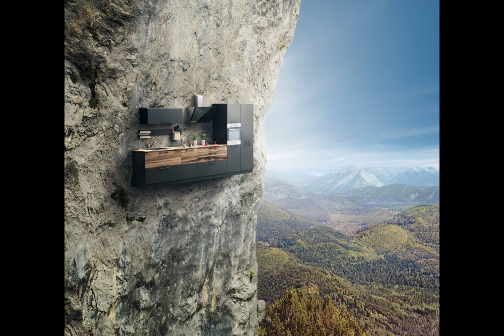 Küche. In einer senkrecht abfallenden Felswand hängt eine Küche samt Ankleide. Was aussieht wie eine Fotomontage, hat ein Elsässer Küchenunternehmen in die Wirklichkeit umgesetzt.