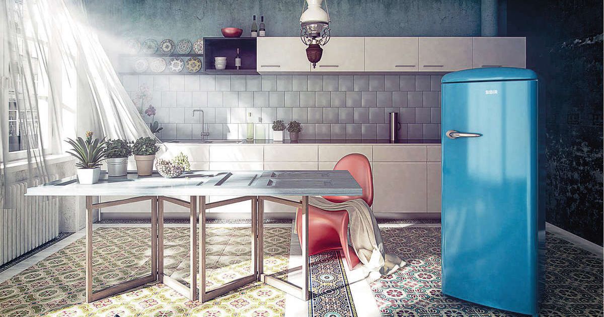 Der Oldtimer-Kühlschrank «OT 272» von Sibir hat einen Nutzinhalt von 281 Litern. Der eintürige Kult-Kühler mit 4-Sterne-Gefrierleistung und LED-Innenbeleuchtung ist mit einer Abtauvollautomatik im Kühlteil, «DynamicCooling»-System sowie vier Glasabstellflächen ausgestattet. Blickfang ist ein platzsparendes, verchromtes Flaschengitter.