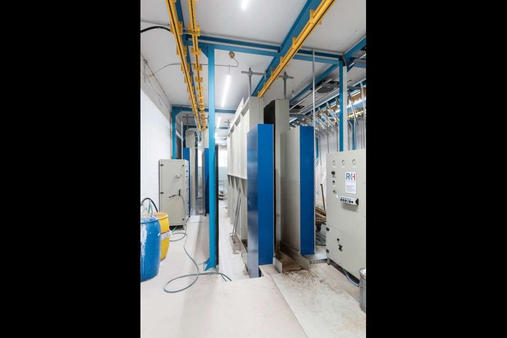 Das Herzstück des Lackierkreislaufs ist ein Lackierroboter von CMA mit 2D-Schräglagen- und Tiefenerkennung. Er ist mit drei Farbpumpen für den automatischen Farbwechsel sowie einer Spülpumpe für die schnelle Reinigung ausgestattet. Der Lackierroboter ist in der Mitte der Spritzkabine auf einem Verschiebewagen montiert. «Wir haben hier eine Sonderkabine, in der die Traverse mit den zu lackierenden Teilen von einer auf die andere Kabinenseite verfährt. Der Roboter lackiert erst die eine Seite, dreht sich dann, wenn die Traverse vorbeifährt, und lackiert anschliessend die zweite Seite», erklärt Claudia Max-Heine den Ablauf. «Gleich- zeitig fährt im Rücken des Roboters bereits die neue Traverse ein.»