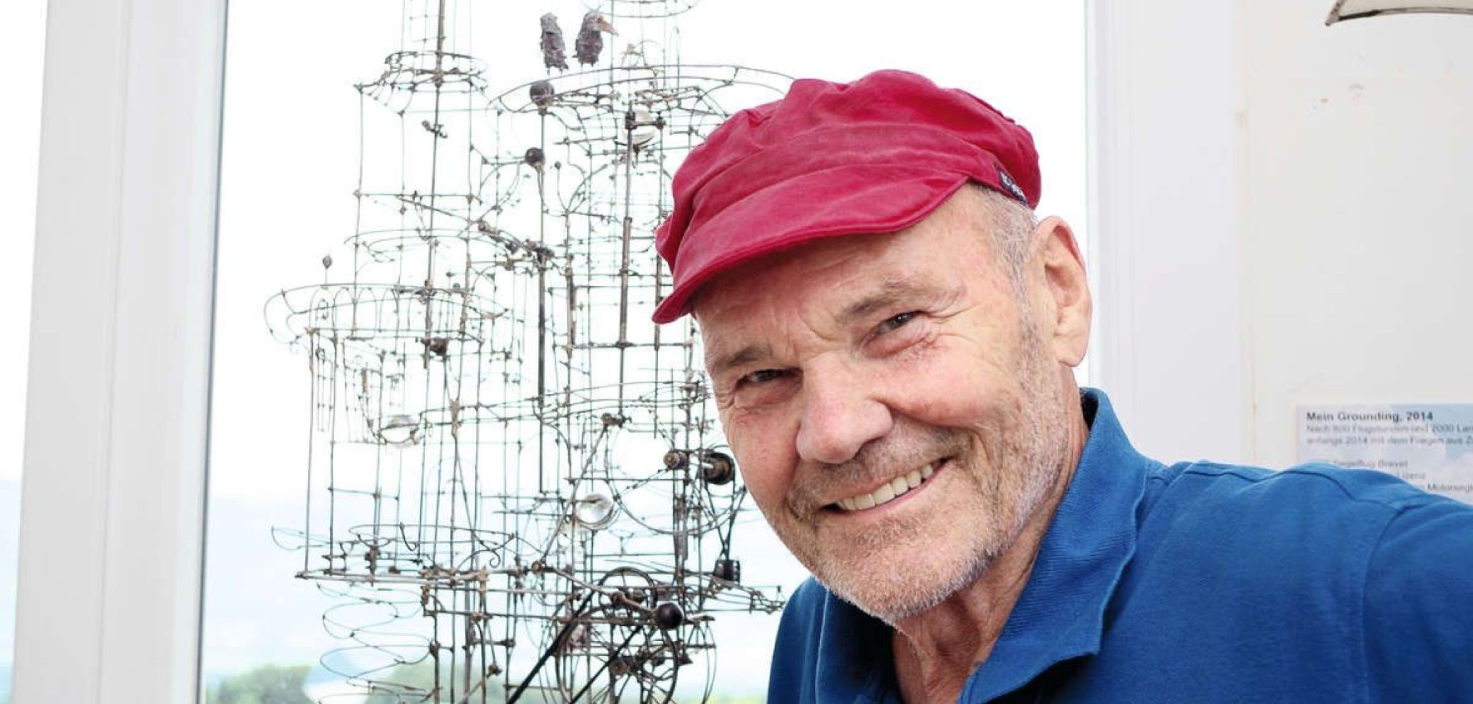 Die rote Schirmmütze ist das Markenzeichen von Yvan Pestalozzi (79). Der gelernte Schreiner ist für seine Metallplastiken und die spielerische Leichtigkeit seiner Kunst bekannt. Bild: Beatrix Bächtold