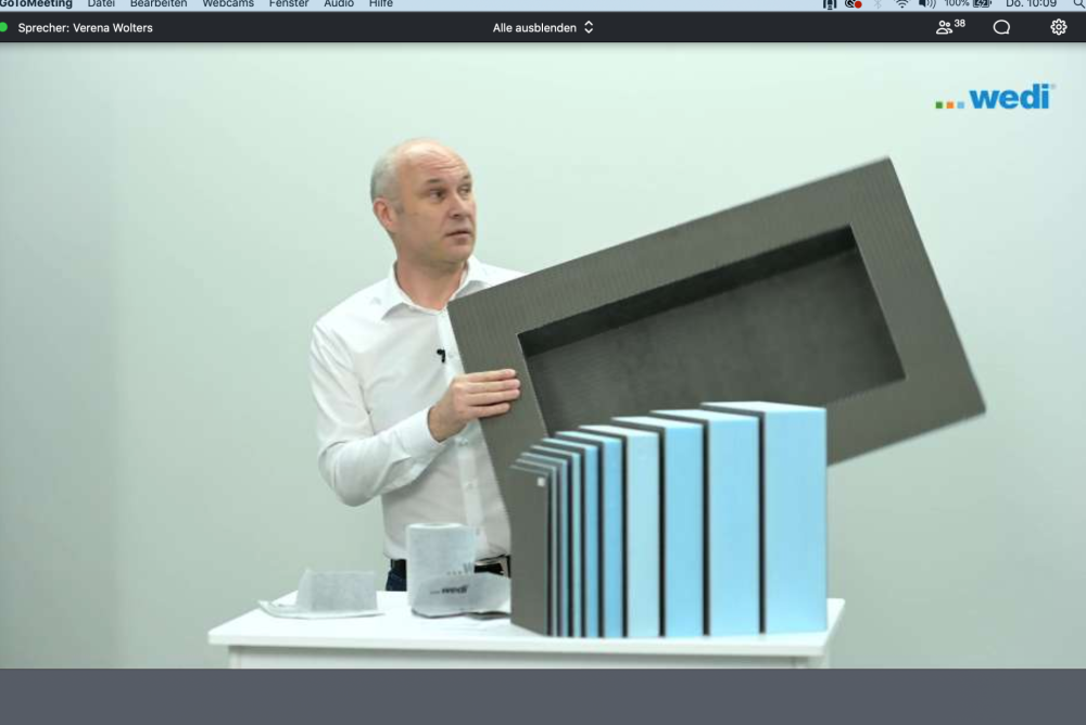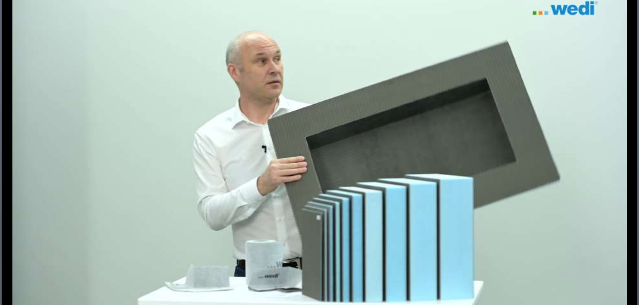 Die Wedi-Bauplatten gibt es in Plattenstärken zwischen 4 und 100 Millimetern. Dazu gesellen sich Module, die sofern sinnvoll, die genormten Bohrungen oder Ausschnitte haben. Es ist eine Art Komplettbausystem für das Badezimmer. Die XPS-geschäumten Platten sind wasserfest und werden miteinander verklebt. An den Plattenstössen wird ein selbstklebendes Armierungsband angebracht, Platten auf der Wand werden mit Dübel und Schrauben befestigt.