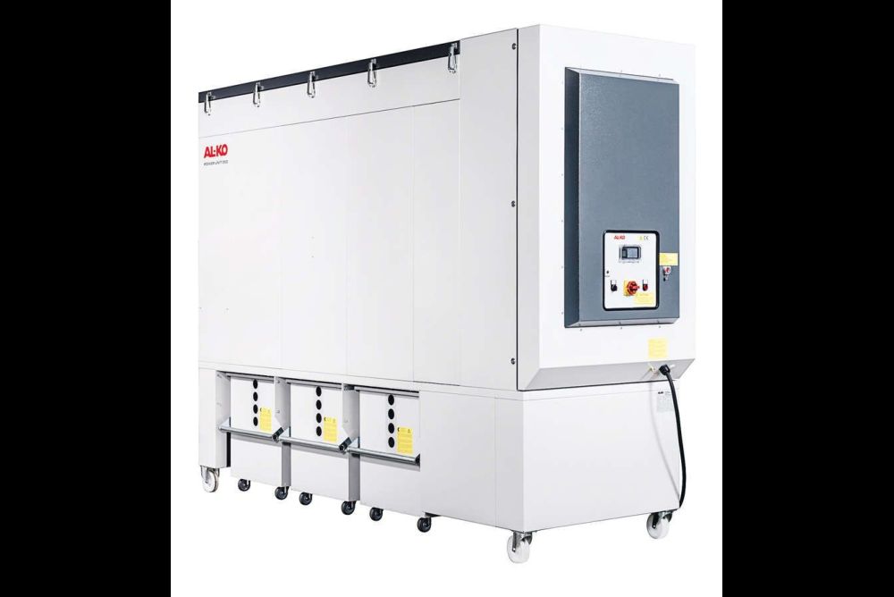 Der «Power Unit 350+» von AL-KO inklusive «Clean Staubschott» ist laut Hersteller effizient, leise, praxisoptimiert und garantiert eine hohe Absaugqualität. Dank des kräftigen und gleichzeitig sparsamen IE3-Motors mit 15 kW arbeitet der mobile Reinluftentstauber mit einem maximalen Volumenstrom von bis zu 10 000 m³/h. Dabei soll er laut Hersteller mit einem maximalen Schallpegel von unter 73 dB(A) bei Volllast über die geringsten Lärmwerte seiner Klasse verfügen. Das kompakte Design und eine spezielle Faltschlauchtechnologie erfordern erfreulich wenig Platz. Insgesamt 73 m2 Filterfläche bei Aussenmassen von 3077 × 1058 × 2351 mm (L × B × H) gewährleisten somit lange Filterstandzeiten.
