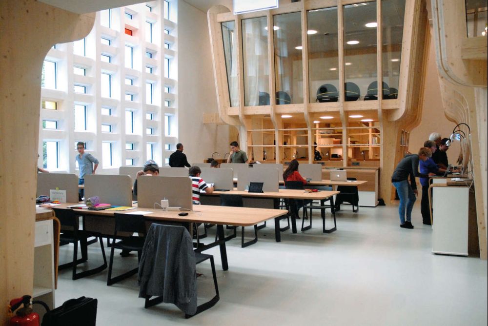 Die Glasfassade der Kirche wurde erhalten. Heute dominieren zwei markante Holztürme den Innenraum: Oben heisst es kommunizieren, unten studieren. Bild: Neue Stadtschulen