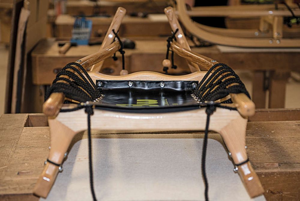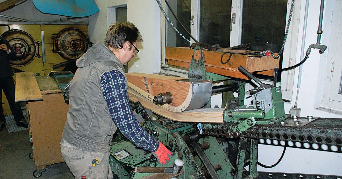 Die vorbereiteten Eschen-Rohlinge werden zum Biegen in einer Form gepresst.