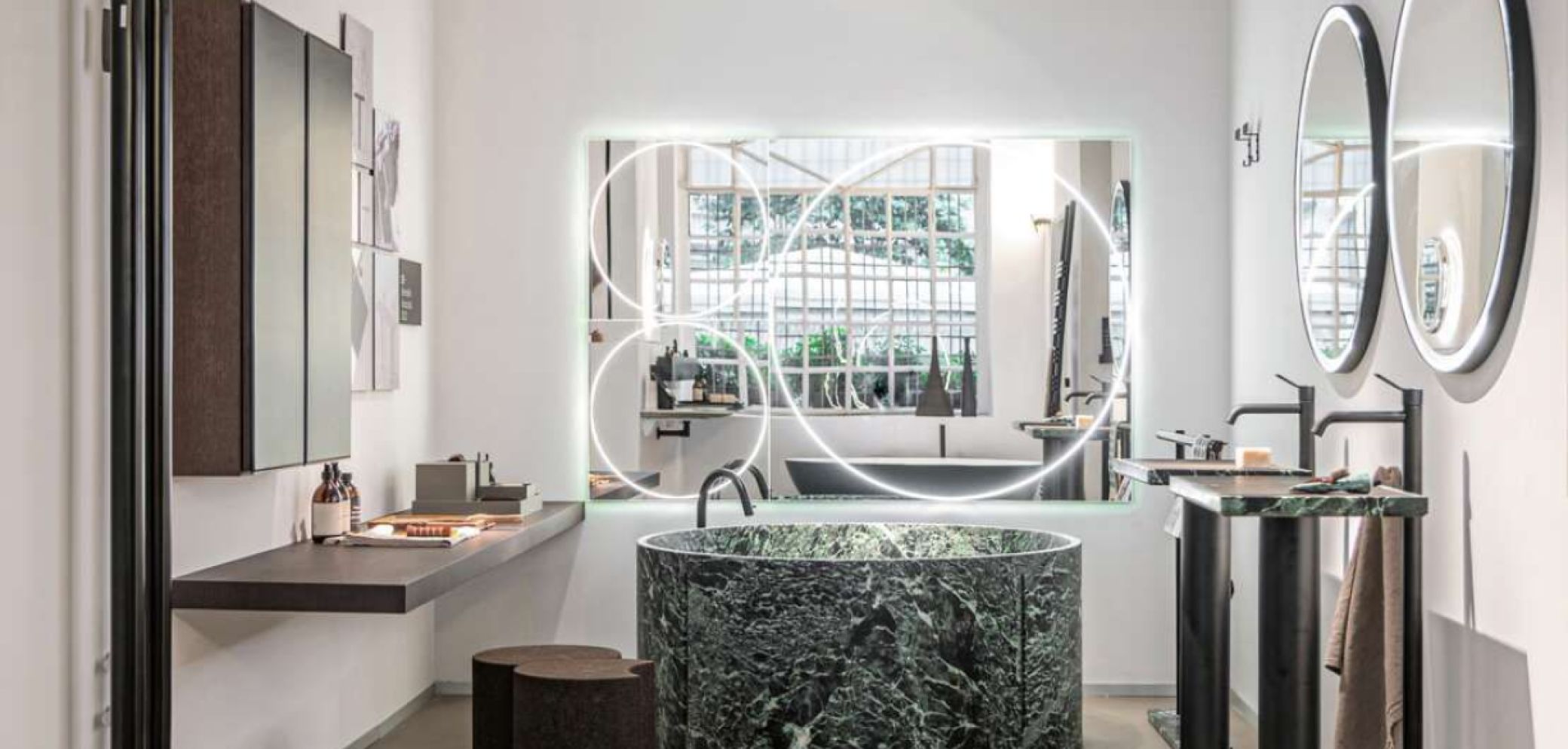 Die Spiegelserie «Vitruvio» von Agape ist in Zusammenarbeit mit García Cumini entstanden. Der Entwurf des Designduos verbindet das Runde mit dem Eckigen. Ein integriertes Lichtband ist kreisförmig in den quadratischen Spiegel eingebettet und umschliesst die reflektierende Oberfläche, die an einen Theaterspiegel erinnert. Dabei entsteht eine glatte Linie, welche Betrachter ganz ohne Schattenwurf beleuchtet. «Vitruvio» ist in den drei Grössen 600, 800 und 1200 mm erhältlich. Die Ausführungen können beliebig miteinander kombiniert werden und eignen sich für viele Raumsituationen und Kompositionen.
