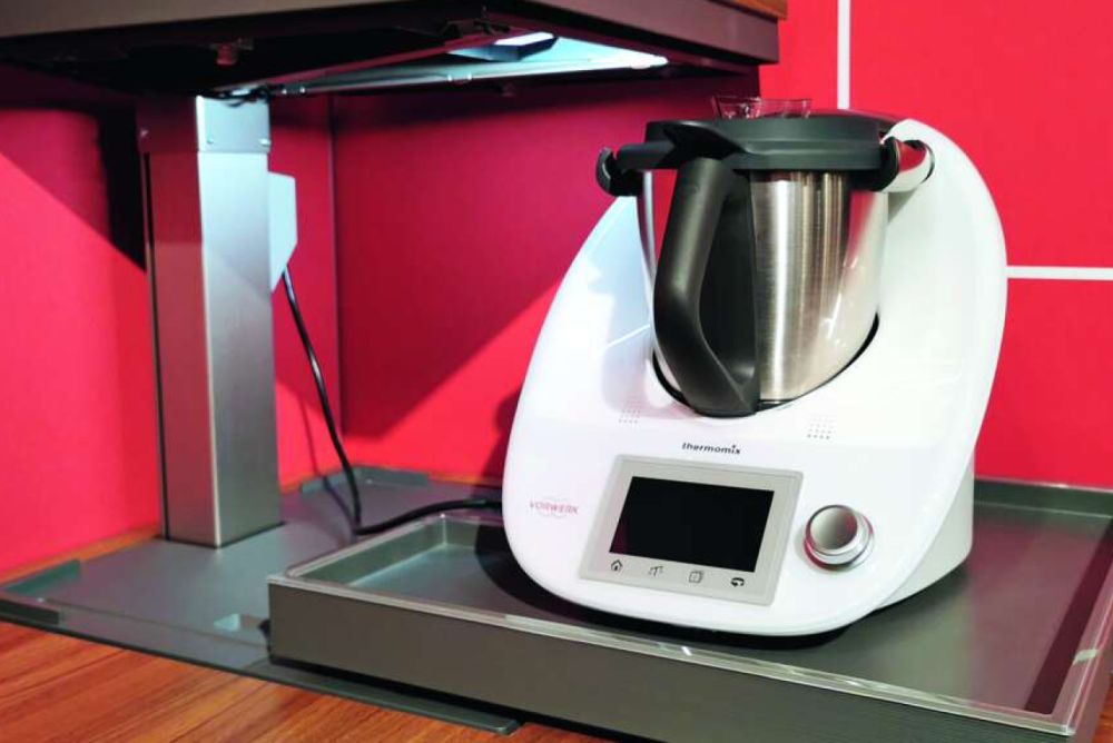 Per Knopfdruck setzt sich der Lift von Ninka in Bewegung. So lässt sich ein schwer zugänglicher Eckbereich bei Unterschränken effizient nutzen. Neu hat Ninka nun eine Konstruktion erdacht, die eine flächenbündige Ausführung mit dem Material der Abdeckung erlaubt. Sichtbar ist im abgesenkten Zustand nur eine umlaufende Haarfuge. Als äusserst praktisch erweist sich das auf Gummirollen geführte Tablar. Nach dem Hochfahren kann eine Maschine für das Benutzen aus der Ecke herausgefahren werden und anschliessend wieder recht geräuschlos verschwinden.