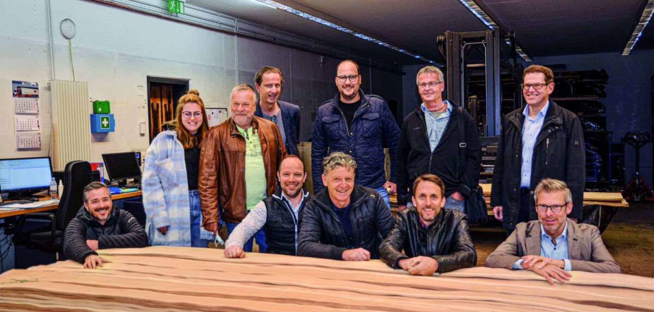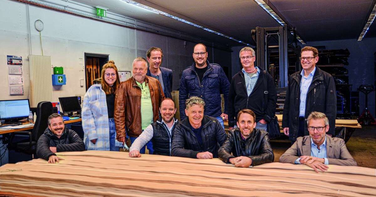 Acht Mitglieder zählt der Furnier-Verband (SFV), geografisch grossflächig verteilt von Genf bis ins St. Galler Rheintal. In Letzterem fand vergangenen Freitag die Generalversammlung statt. Genauer gesagt bei der Atlas Holz AG in Trübbach. 2002 gegründet, ist das Familienunternehmen in den vergangenen Jahren stetig gewachsen und zählt heute 28 Mitarbeitende. Der Ausstellungsraum bot nach einer Führung durch den Betrieb einen schönen Rahmen für den offiziellen Teil der GV. Neben sieben Stimmberechtigten konnte Präsident Markus Barmettler zwei potenzielle Neumitglieder begrüssen. Zu Gast war zudem der Thurgauer Ständerat Jakob Stark, der Anfang Mai das Präsidium des Schweizer Holzwirtschaftsverbandes Lignum übernommen hat.