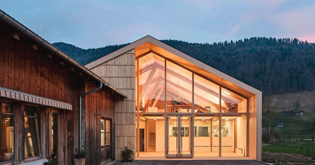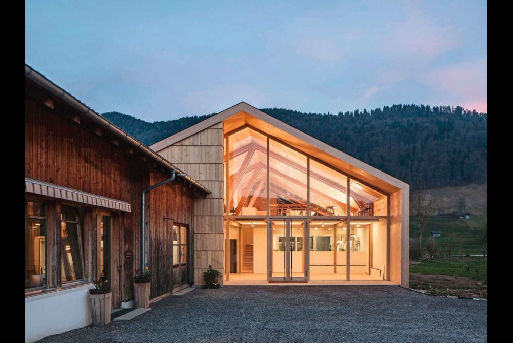 Der Erweiterungsbau einer Schreinerei mit Baubuche. Das Schichtholz verleiht dem Gebäude einen gänzlich anderen Charakter als das gewohnte, astige Nadelholzbild. Bild: Christian Grass / Pollmeier