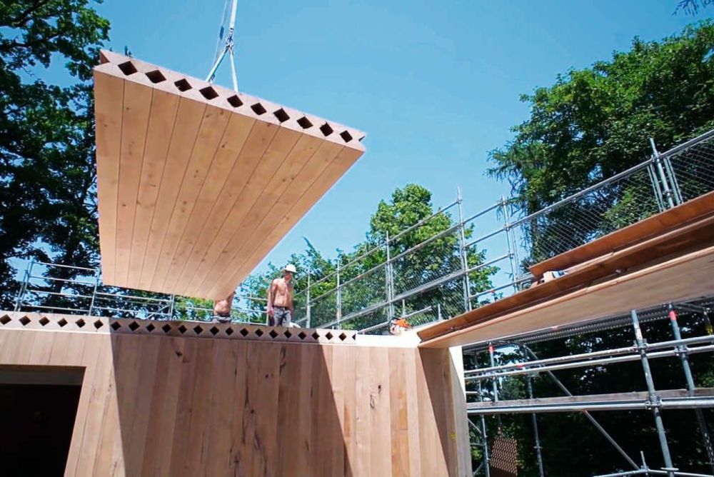 Praktische Erfahrung mit zusammengesetzen Querschnitten mit der Buche gibt es inzwischen bei Triasol in Aeschau BE. Für die Erneuerung des Werkhofs im Albisgüetli in Zürich kamen bei den Geschossdecken Triasol-Elemente in Buchenholz zum Einsatz. «Dank des Einschnittverfahrens von Triasol im Riftschnitt kann die Verformung von Buchenholz bestmöglich aufgefangen werden, weshalb wir bei der Realisierung dieses Pilotprojektes beteiligt wurden», berichtet Simon Wüthrich von der Wüthrich Holz AG. Bei der Produktion von Triasol werden zunächst dreieckige Querschnitte erzeugt, die dann später gehobelt und miteinander verleimt werden. Dabei stellte der Einschnitt des Rundholzes im Nadelholzwerk keine Schwierigkeit dar. Das Trocknen sei zwar langwierig gewesen, aber ebenfalls ohne Weiteres machbar. Schwieriger gestaltete sich die Suche nach einem geeigneten Klebstoff für Laubholz mit tragendem Zweck. Aber: «Die Ausschussquote nach jedem Verarbeitungsschritt war viel höher als bei Nadelholz. Eine Verarbeitung von Buche ist daher deutlich teurer, weshalb eine Serienproduktion zurzeit eher unwahrscheinlich ist», sagt Wüthrich.