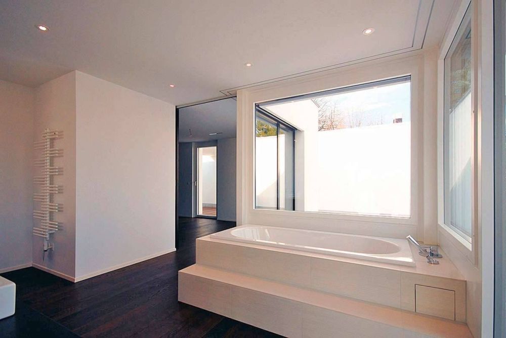 Für das Badezimmerfenster können meistens die gleichen Materialien gewählt werden wie für die weiteren Wohnraumfenster. «Dieser Punkt ist zentral in der Fensterplanung, da meistens im ganzen Gebäude das gleiche Fenstersystem eingesetzt werden soll», sagt Irene Hunkeler. Dies ist bis auf eine Ausnahme in der Regel möglich. «Sobald ein Fenster Spritzwasser ausgesetzt ist oder sich sogar im Duschbereich befindet, raten wir zu einem Kunststofffenster», sagt Irene Hunkeler. In diesem Fall ist die sorgfältige Aufklärung des Kunden wichtig. Besteht der Kunde trotzdem auf den Einsatz eines Holz- oder Holz-Metall-Fensters, sollte ein Spritzschutz in Form eines Duschvorhanges oder einer zusätzlichen Glasscheibe vorgesehen werden.