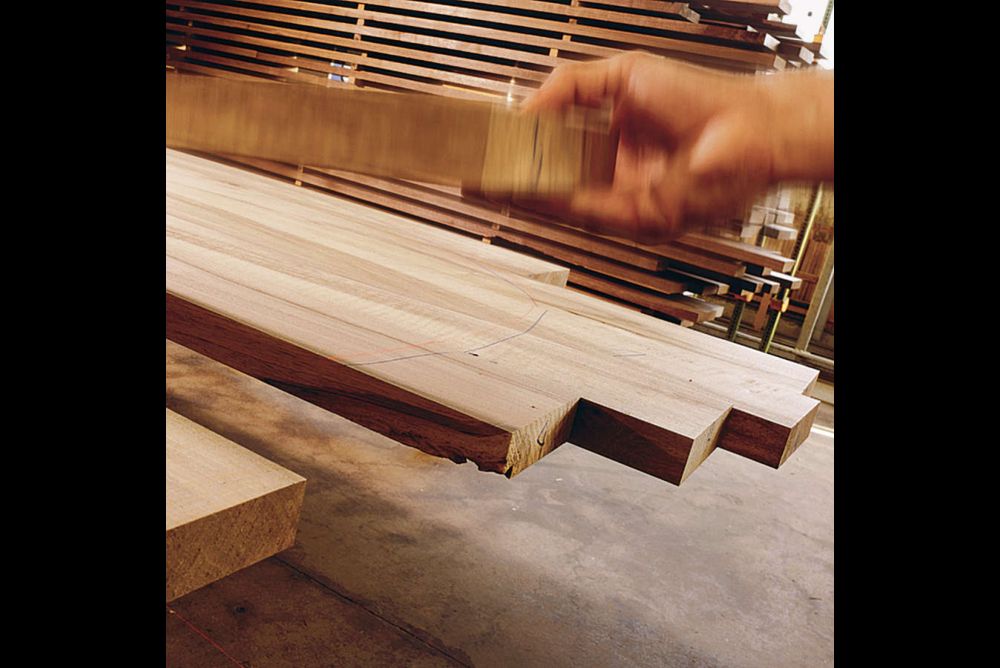 Die Frage, ob man unter wirtschaftlichen Gesichtspunkten solche Möbel nicht besser furnieren sollte, stellt sich gar nicht. «Es handelt sich dabei um völlig unterschiedliche und deshalb nicht zu vergleichende Ergebnisse», ist sich Röthlisberger sicher. Um rein optisch ein zumindest ähnliches Ergebnis erzielen zu können, wäre es etwa so, als ob man von jedem einzelnen Furnierpaket nur ein Blatt verwenden würde. Freilich müssten die Pakete dann aus ein und demselben Stamm entstammen. Der Charakter und die Anmutung wären trotzdem anders. Auch mit entsprechend gut ausgestatteter Werkstatt, wie etwa Vierseiten-Hobelmaschine und Verleimständer, sind Massivholzmöbel in der Produktion deutlich teurer gegenüber Holzwerkstoffen, ist Wildi überzeugt. «Unterschätzt wird vor allem der Verschnittanteil, wenn man mit Massivholz arbeitet. Wir rechnen immer mit mindestens 100 % Verschnitt, wenn man von Klotzbrettern ausgeht», sagt Wildi. Die lehrbuchmässigen Sätze von 50 bis 70 % hält der Schreiner für viel zu gering in der Praxis, vor allem wenn ein bestimmtes Bild aus massivem Holz erzeugt werden soll. Das sieht auch Lindauer so: «Selbst die 100 % sind oft eher knapp.» Nicht selten geht es schnell weit darüber hinaus, sind sich beide Schreinereiinhaber einig.