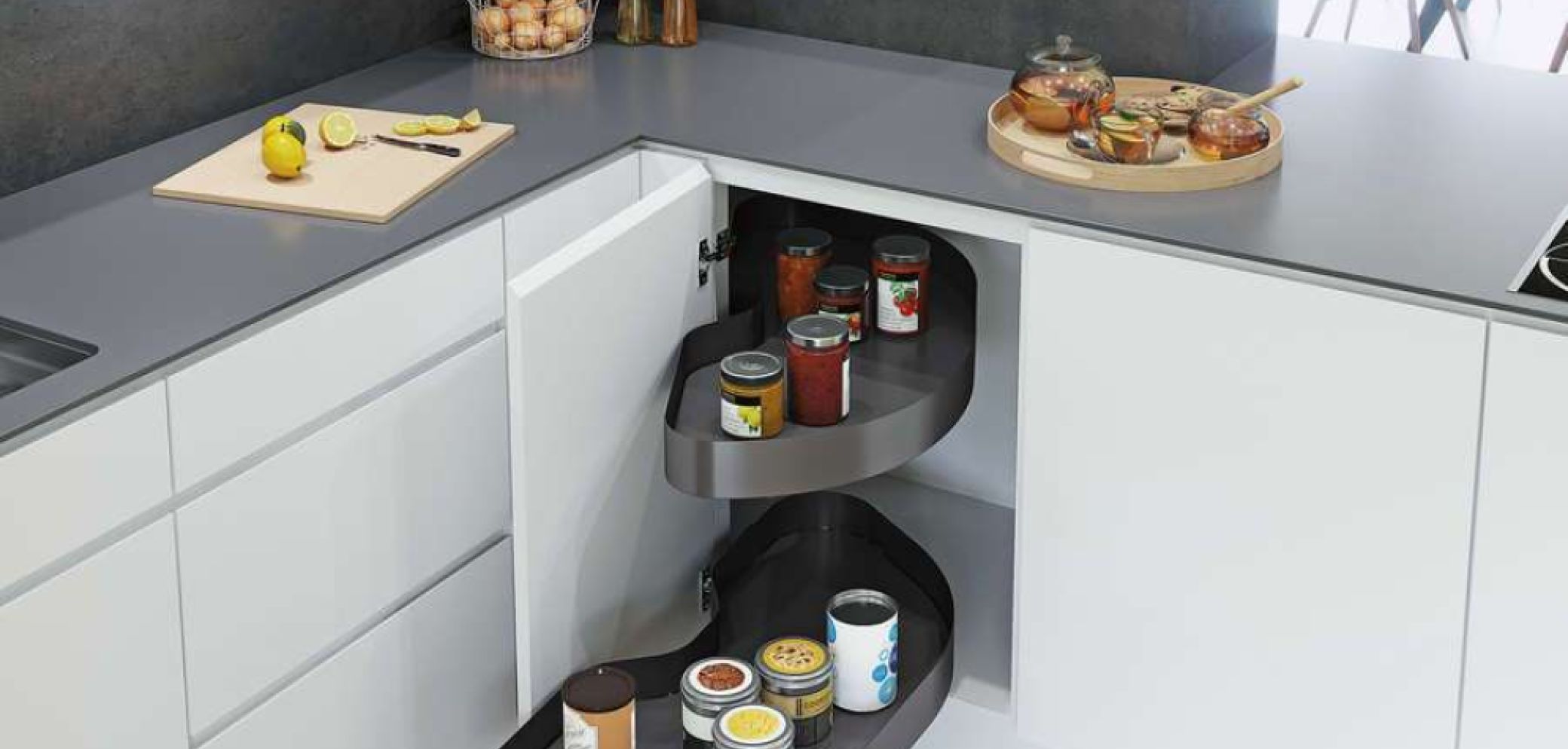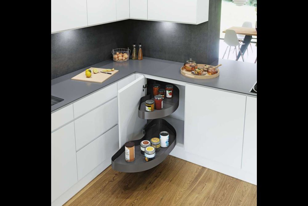 Mit der Eckschranklösung «Cornerstone MAXX» bringt Vauth-Sagel ein System auf den Markt, welches die Innentablare gradlinig vor den Küchenschrank schwenkt. Die Ansprüche der Endkunden sowie der Monteure wurden bei der Entwicklung gleichermassen berücksichtigt, was zu dieser komfortablen Lösung geführt hat. Die gradlinigen Tablarböden verzichten auf unnötige Einbuchtungen und lassen sich grossflächig beladen.
