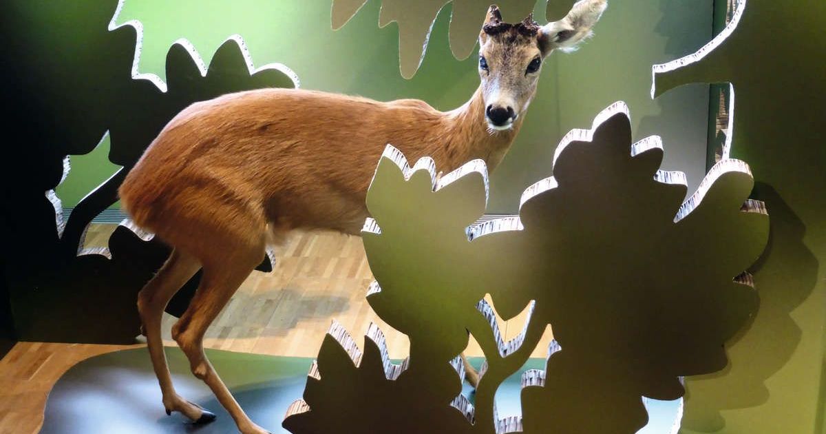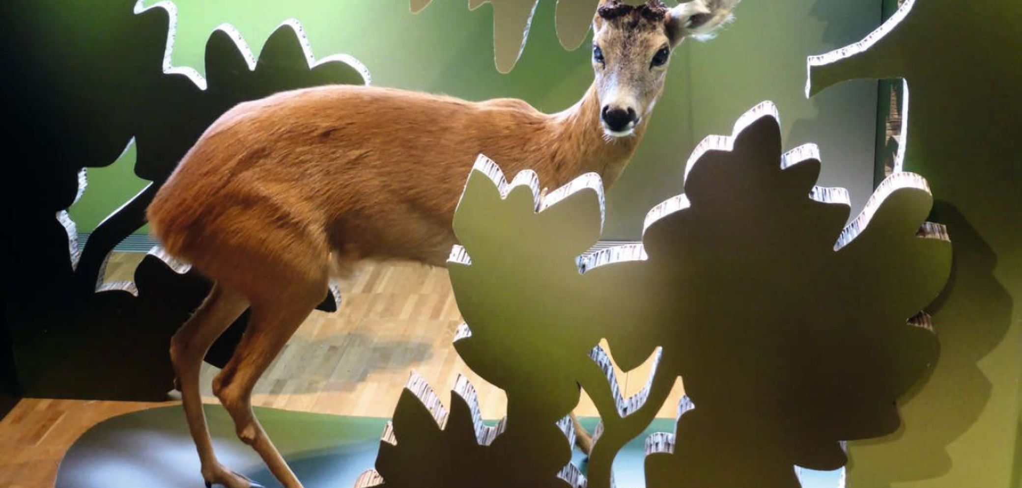 Im Wald aus Wabenplatten versteckt sich ein ausgestopftes Reh.