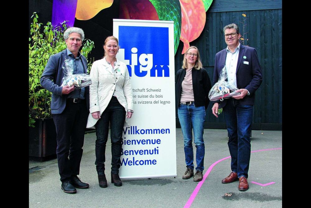 Anlässlich der Herbstversammlung von Lignum Schweiz kam es zu Wechseln und Ergänzungen im Vorstand der Dachorganisation der Schweizer Wald- und Holzwirtschaft. Ziel der personellen Rochaden und einer Änderungen der Vereinsstatuten sei es, die Vernetzung mit den Regionen zu stärken, heisst es in einer Mitteilung. Neu als Vertreter der Regionen hat die Versammlung den Lu- zerner Pirmin Jung (r.) gewählt. Er präsidiert die Sektion Zen- tralschweiz. Als Folge davon musste Jung als Vertreter der Lignum-Direktmitglieder aus dem Vorstand ausscheiden. Weil zudem der Zürcher Architekt Beat Kämpfen (l.) zurücktrat, entstanden zwei Vakanzen. Diese besetzten die Delegierten mit der Thurgauer Sägerei-Unternehmerin Maria Brühwiler (2. v. l.) und der ETH-Architektin Audanne Comment (2. v. r.). Sie ist Redaktorin der Westschweizer Baufachzeitschrift «Tracés».