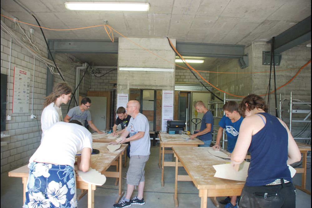 Kaum angekommen, ging es schon an die Arbeiten. Die ersten Instruktionen wurden von Irene Schuler Stäger, Leiterin Grundbildung beim Verband Schweizerischer Schrei-nermeister und Möbelfabrikanten (VSSM), erteilt und das Skizzieren begann. Mit den entworfenen Skizzen wurden die Slalomboards verschönert. Reto Wyler, Florian Abegg, Matthias Grädel, Sebastian Berroth, Ronny Fretz, Patrik Inauen und Sabrina Wenger (Bild links unten, im Halbkreis von links nach rechts) schliffen fleissig um die Wette. Nach dem Schleifen wurde noch Grundierung aufgetragen.
