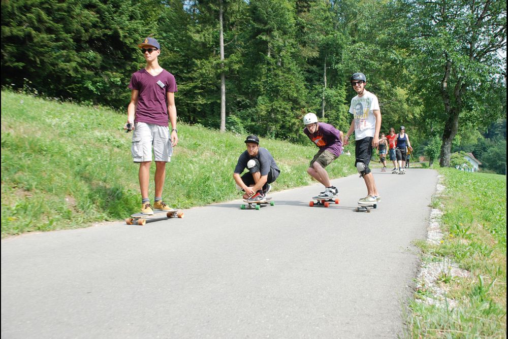 Der Slalomboardprofi Chris Hart führte in das Wissen des Skatens ein und schon nach wenigen Minuten bewiesen Karol Ratajski, Marc Zollinger, Flurin Krebs und Lukas Hefti auf ein paar Testboards ihr Können. Die Fahrstunden verliefen zum Glück für alle unfallfrei.