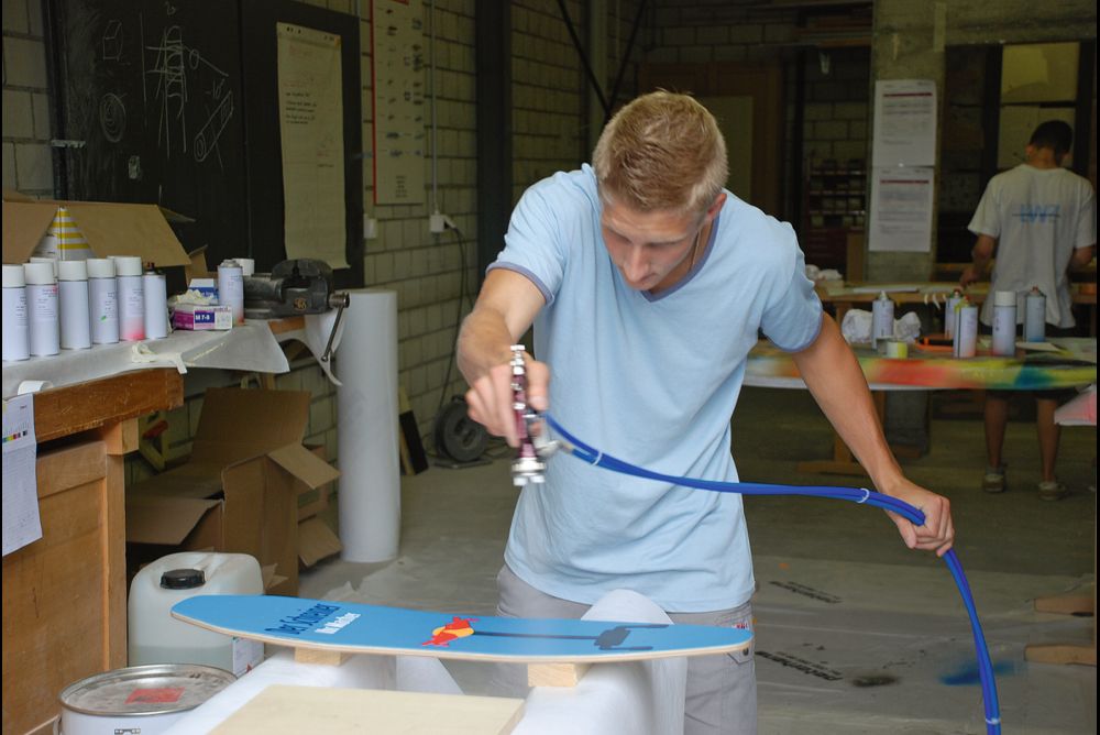 Seine geniale Kreation deckte Ronny Fretz zum Schluss noch mit einer Lackschicht. Nach der Trocknungszeit war die Oberfläche fertig. Das Slalomboard nahm langsam Gestalt an.