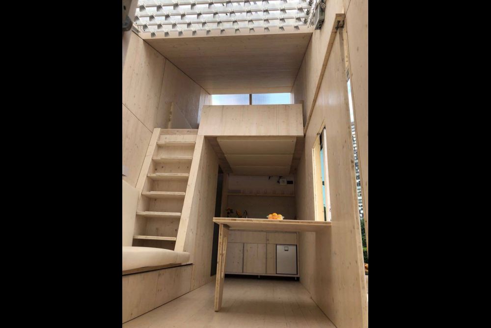 Holzbau. Es nimmt 22 Quadratmeter in Anspruch, versorgt sich selbst mit Strom und Wasser und ist voll und ganz aus Holz gebaut. Dieses Minihaus ist ein kleines Raumwunder und wurde von der UNO konzipiert.