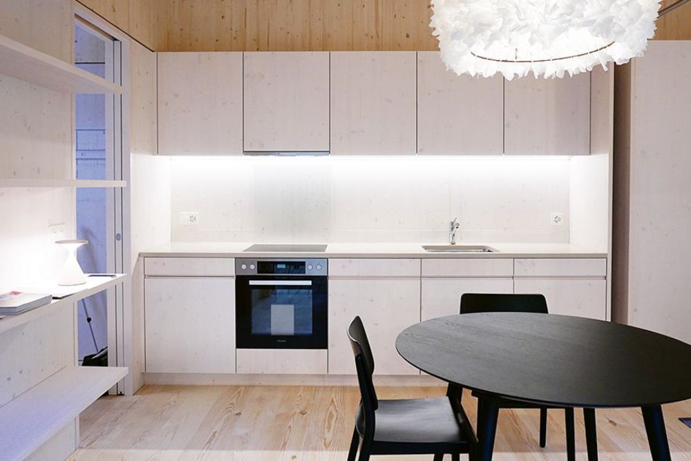 Rainer Borcherding hat sein Minihaus-Konzept an der Interior-Design-Ausstellung Neue Räume im November 2019 in Zürich einem grösseren Publikum vorgestellt. Das dort gezeigte «Mini-one» wurde eigens für die Ausstellung realisiert. Einbauten wie Küche und Schränke zeigen, wie sich der kompakte Raum optimal nutzen lässt. Entsprechend den Modulor-Proportionen sind Fronten bis 1,80 m weiss lasiert, alle Flächen darüber bleiben unbehandelt.