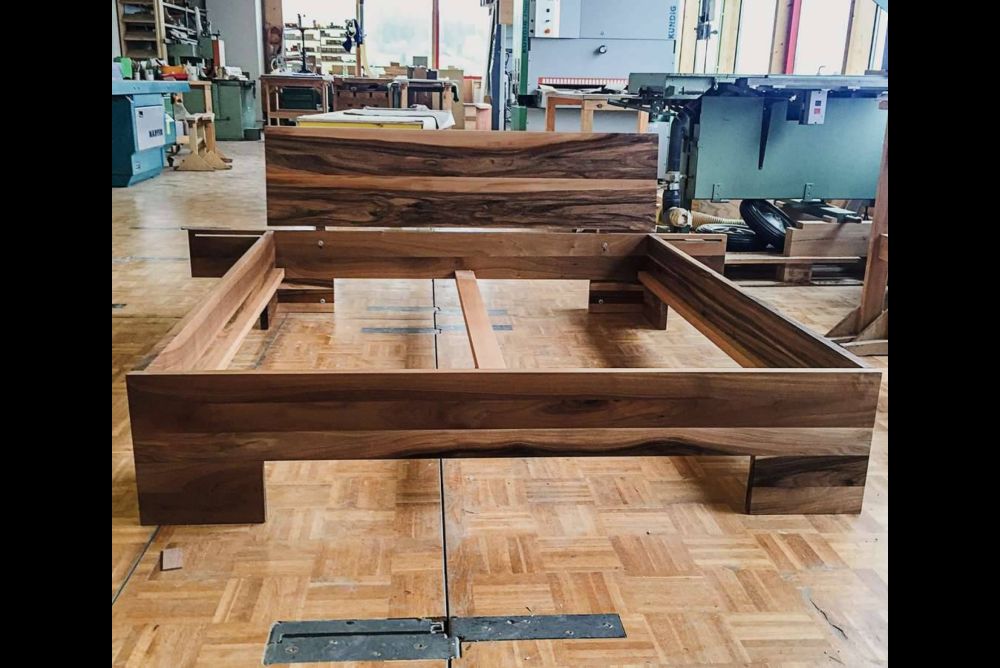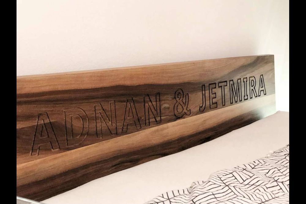 An meinem Nussbaumbett, das ich für den EBA-Abschluss gebaut habe. Das war noch bei meinem vorherigen Arbeitgeber. Bei Kuster konnte ich dann noch die Inschrift mit der CNC machen.