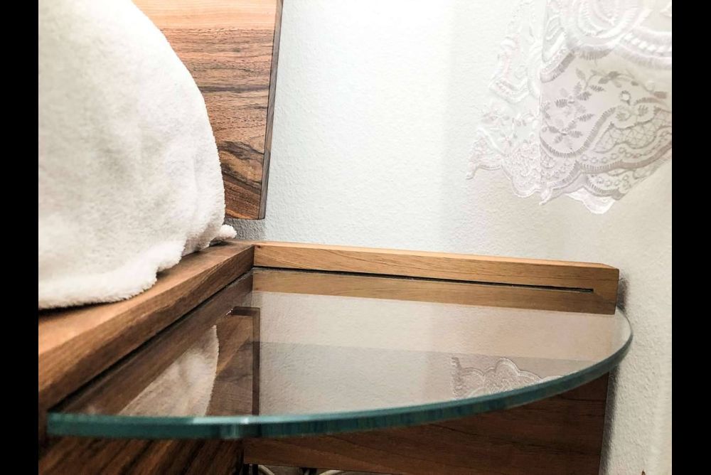 Ich fragte im Team in die Runde, ob jemand eine Idee habe, und ein Kollege hat mir dann mit der Planung geholfen. Das Bett ist 1,60 × 2 Meter gross und hat auf der Kopfseite zwei Glasflächen mit integrierten LED. So brauche ich keine zusätzlichen Nachttischchen.