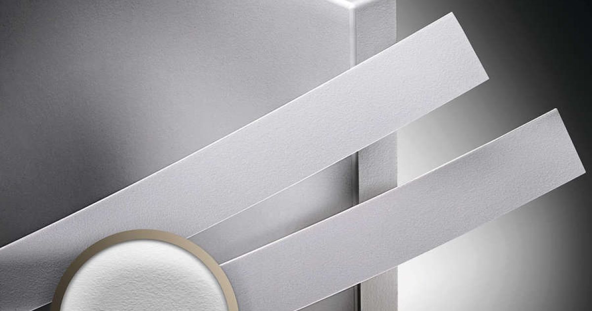 Bei der neuen «Büttenstruktur» von Ostermann handelt es sich um eine relativ ruhige Oberflächenprägung mit dezenter, filigraner Haptik. Anders als die etwas intensivere «Miniperl»-Prägung stand sie lange Zeit nicht im Fokus der Verarbeiter. Jetzt hat Ostermann die neue Prägung bewusst in sein Kantensortiment aufgenommen, denn die meisten klassischen Büromöbel sind mit einer Oberfläche in «Büttenstruktur» versehen. Sie ist ruhig und relativ unempfindlich gegenüber Kratzern sowie Flecken. Das macht sie geeignet für klassische Büroeinrichtungen und Büromöbel. Aus diesem Grund ist diese Oberfläche in der Branche auch als «Büro»-Struktur bekannt. Angeboten wird zunächst Lichtgrau und Weiss; das Farbspektrum wird kontinuierlich erweitert. Die Kanten werden in allen Breiten von 16 bis 100 mm, in den Stärken von 1 und 2 mm und ab einer Länge von 1 m geliefert – ab Lager innert 48 h.