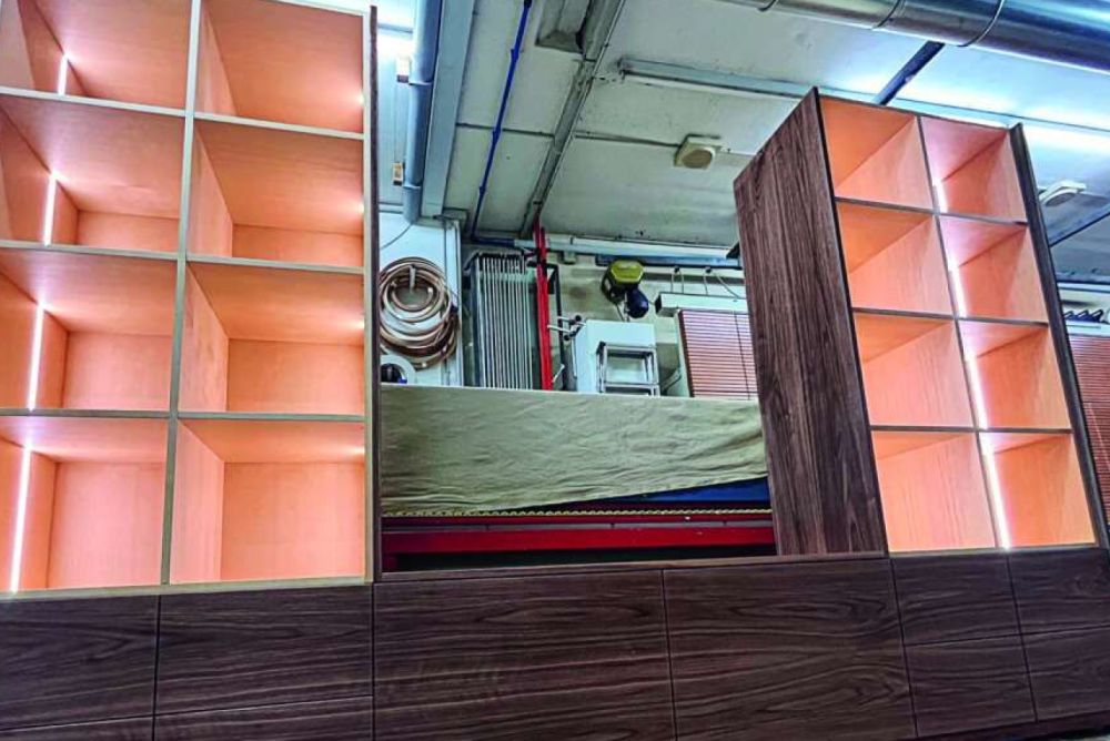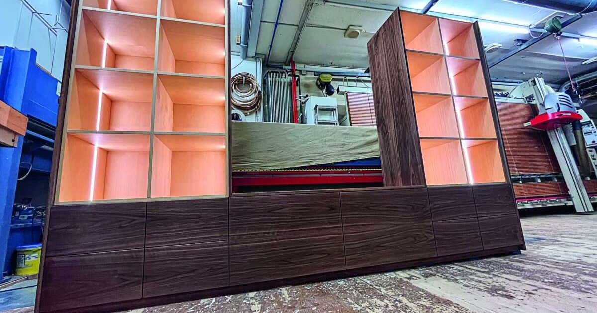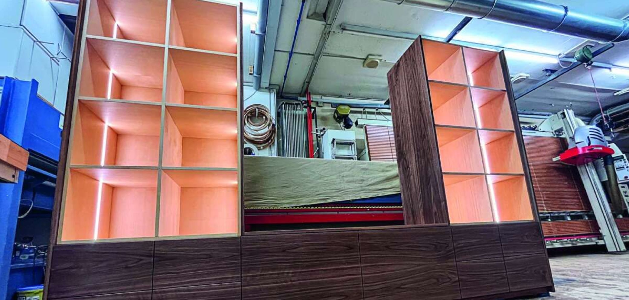 Für den unteren Bereich und die Aussenwände Nussbaum und für die Regale Esche. Zuerst wollte ich eine Kombination aus Ahorn und Nussbaum nehmen, habe mich aber umentschieden. Ich habe die Fronten und Sichtseiten furniert, was ich zuvor nur wenig gemacht habe. Für die Beleuchtung habe ich LED-Lampen gewählt, weil diese hochwertig sind, und sie in der Mitte des Regals platziert.