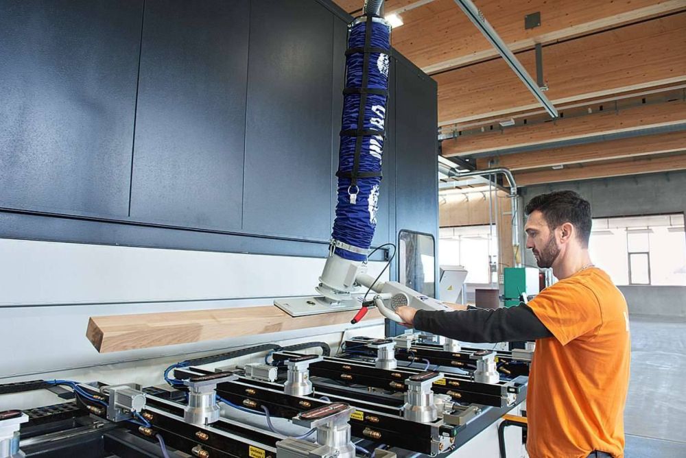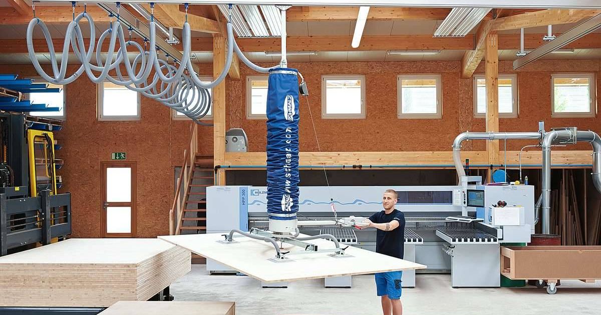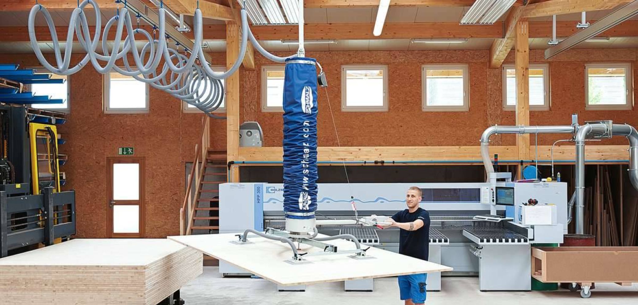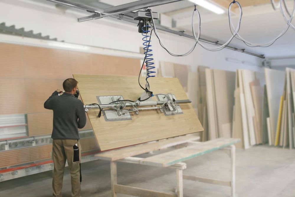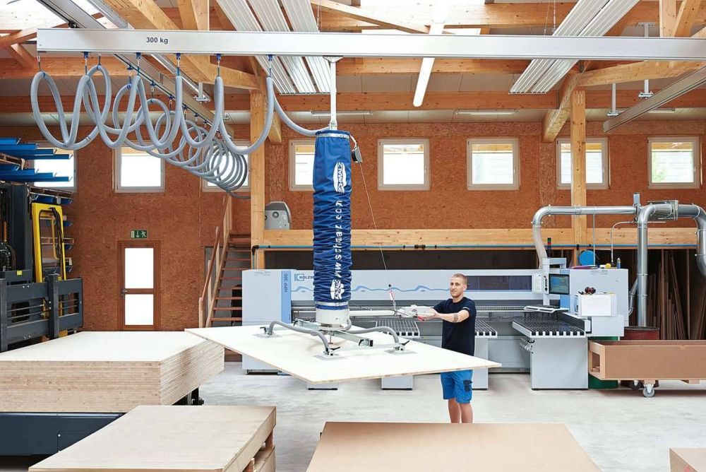 In einer Schreinerei werden viele Materialien verarbeitet und besonders im Zuschnittbereich schaffen Krananlagen grosse Vorteile, besonders solche, die schnell und unkompliziert zu bedienen sind. Für jeden Kranhersteller ist klar: Zuerst muss definiert sein, was genau alles gehoben werden soll. Erst dann kann nach guten Lösungen gesucht werden.