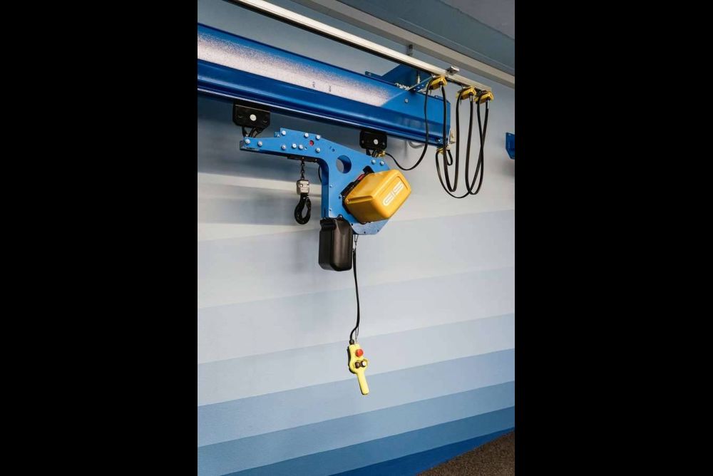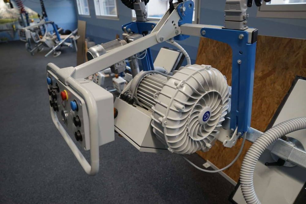 Der Hubschlauch zieht sich zum Heben zusammen und dehnt sich beim Absenken wieder kontrolliert aus. Auch eine 90-Prozent-Schwenklösung in die Vertikale gibt es. Sie schafft 120 Kilogramm. Aufgehängt wird der Schlauchheber wie der Kettenzug an Kranprofilen, wobei der Vakuumerzeuger dezentral angebracht ist und die Energie über einen Verbindungsschlauch liefert. Eine Kranlösung wird es für die meisten Firmen geben, sie muss aber zusammen mit einem Spezialisten gesucht werden.
