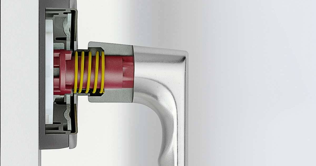 Zum Öffnen des Fensters wird der Griff erst in Richtung Rosette gedrückt, um die Griffsperre zu lösen, und dann wie gewohnt gedreht. Beim Schliessen oder Kippen des Fensters wird der Griff dann wieder gesperrt.