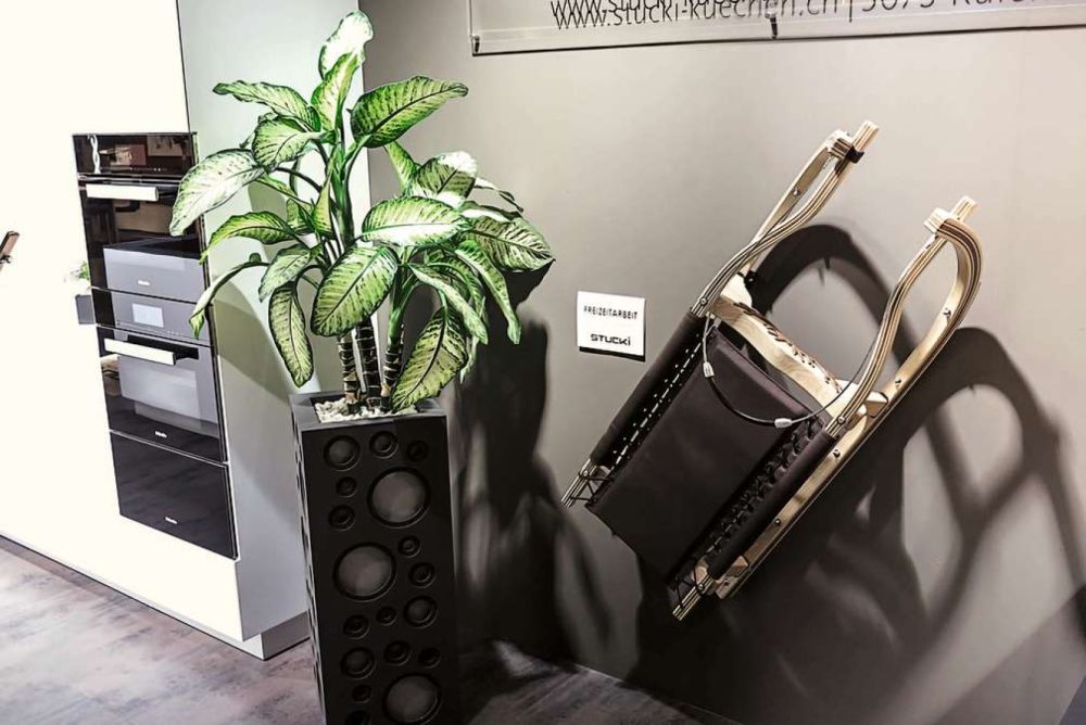 Das Gerüst besteht aus Esche und Nussbaum, die Kufen aus Edelstahl. Die Sitzfläche ist aus Kunstleder und Schaumstoff, ich nähte sie mit meinem Grosi zusammen. Am Anfang wollte ich die Sitzfläche aus Stoff mit Edelweissmuster herstellen, um es passend zu den Einfräsungen in den Beinen zu machen, musste dann jedoch auf ein abperlendes Material zurückgreifen. Das Hirschgeweih vorne ist auch in Nussbaum, ich habe es ausgeschnitzt und dann eingelassen, weil es nur geleimt in der Kälte nicht genug halten würde.