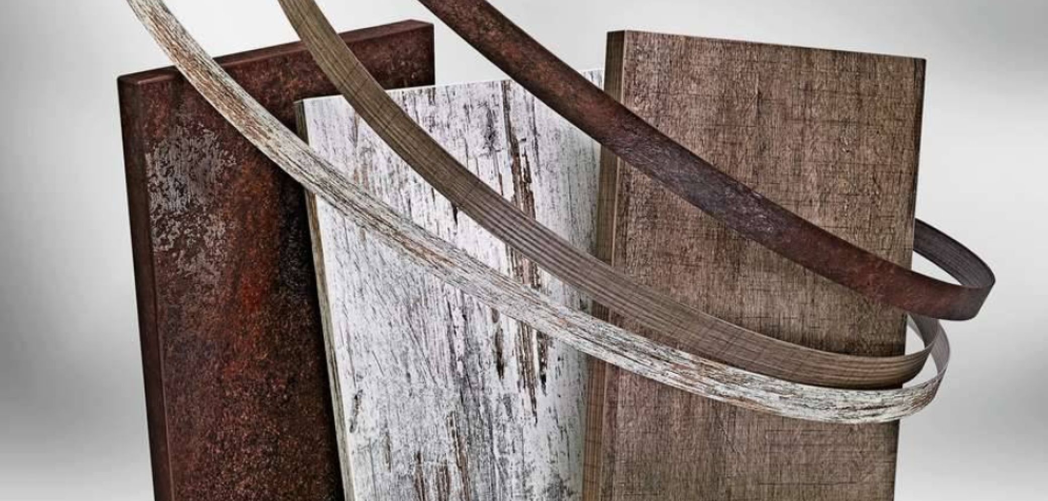 Mit Oberflächen im Vintage-Look und den passenden Kanten und Beschlägen von Ostermann lassen sich moderne Möbel bauen, welche die Sehnsucht nach Nostalgie mit moderner Funktionalität verbinden. Auf der ABS-Kante «Vintage Holzstruktur» ist die Farbe ausgeblichen oder abgeblättert, an vielen Stellen kann man schon das darunterliegende Holz sehen. Dunkle Kratz- und Schleifspuren bezeugen, dass die Oberfläche schon einige Jahre alt ist. Rost färbt ab, bröckelt und manchmal rostet es sogar munter weiter. Deshalb gibt es viele Möbeloberflächen mit Rostdekoren, die den einzigartigen Look und die besondere Haptik imitieren. So auch die ABS-Kante «Ceramic rusty Steinprägung». Bei der ABS-Kante «Vintage Eiche Holzstruktur» wird das klassische, nachgedunkelte Eichendekor mit dezenten dunklen Schleifspuren versehen.