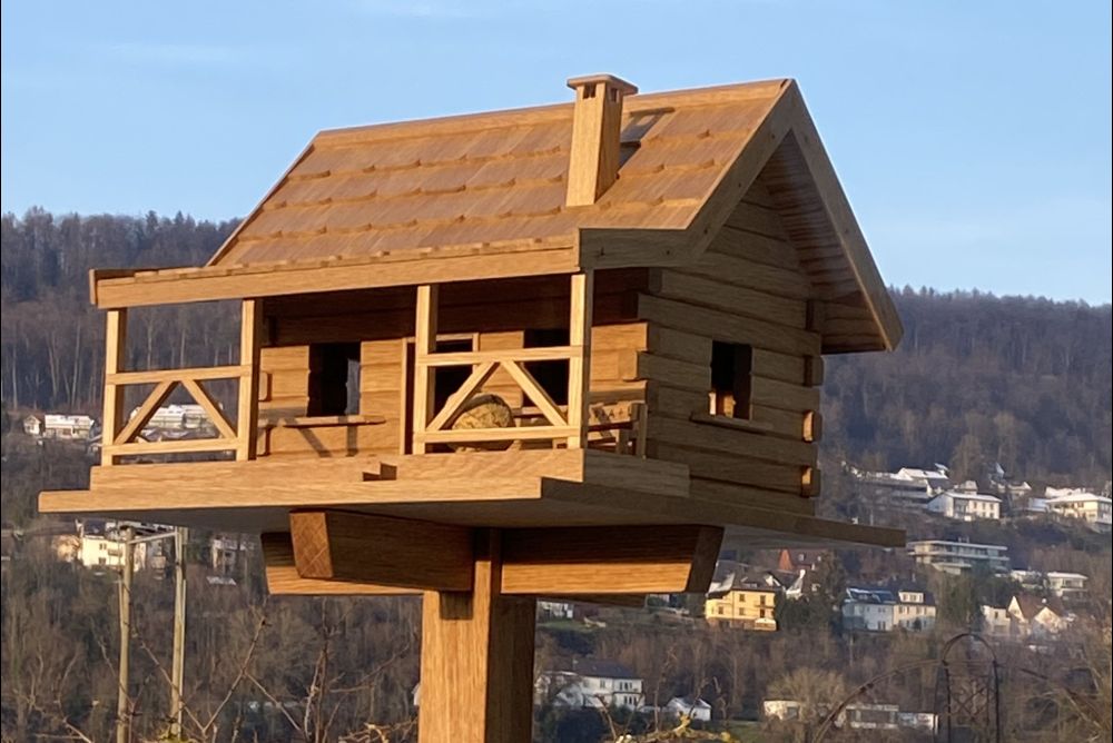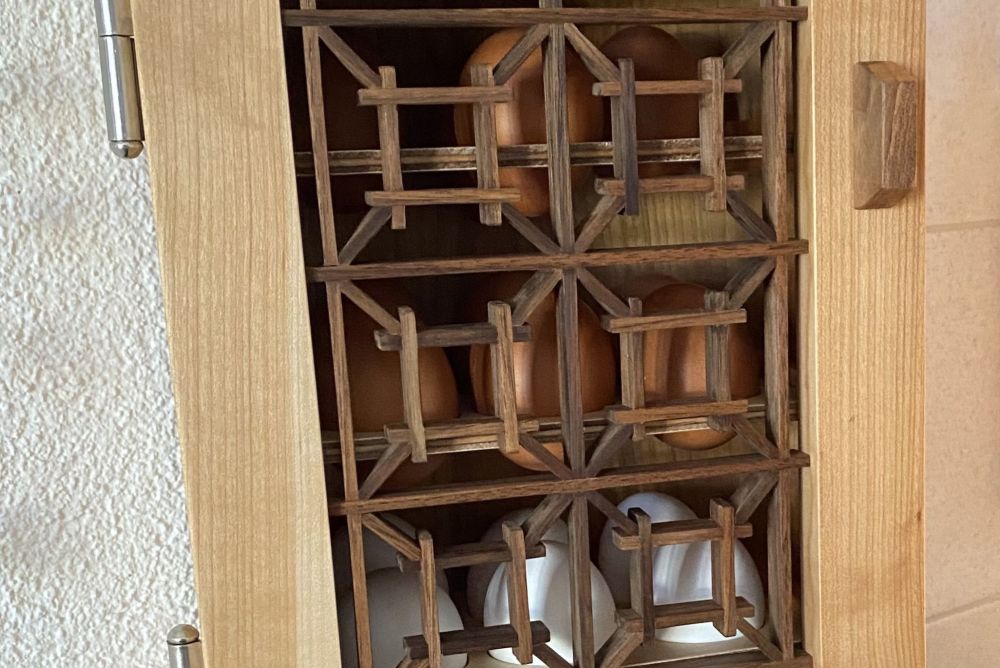 In seiner Kellerwerkstatt hat alles seinen Platz. Für die Holz- und Metallbohrer hat er ein kleines Schrankmöbel gebaut. Alle Werkzeuge sind fein säuberlich versorgt. Unter der Decke sind Zwischenebenen eingebaut, auf denen Massivholz platzsparend lagert. Während zwei Jahren hat Hauser den Raum umgebaut. Er tüftelte aus, wie er die begrenzte Fläche am besten nutzen könnte. Erst als alles geordnet und eingerichtet war, begann er, die ersten Möbel zu schreinern. Möbel für den Alltag, ein kleines Eierkästchen mit japanischer Kumiko-Füllung, Kleinmöbel, ein filigranes, übersichtliches Gestell für Teebeutel oder auch ein Hochbeet. Besonders stolz ist er auf ein Vater-Sohn-Projekt: eine Solar-Anzeige aus Holz, die er mit seinem Sohn, einem Informatiker, entwickelt und gebaut hat. Diese zeigt die aktuelle Solarstrom-Produktion auf dem Dach an und den Stand der Batterie.