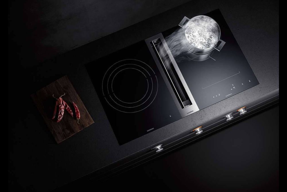 Gaggenau bietet mit CVL 420 und CVL 410 zwei neue Kochfeldkombinationen mit integrierter Lüftung und einer Breite von 880 mm an. Mit dem neuen Gerätekonzept werden die Kochfelder jetzt rahmenlos und flächenbündig in die Arbeitsfläche integriert. CVL 420 besteht aus zwei «Vario-Flex»-Induktionskochfeldern mit insgesamt vier Kochzonen. Diese sind durch die mittig platzierte Muldenlüftung miteinander verbunden. Auf jedem Kochfeld können die Kochzonen einzeln oder kombiniert als eine grosse Kochzone verwendet werden.