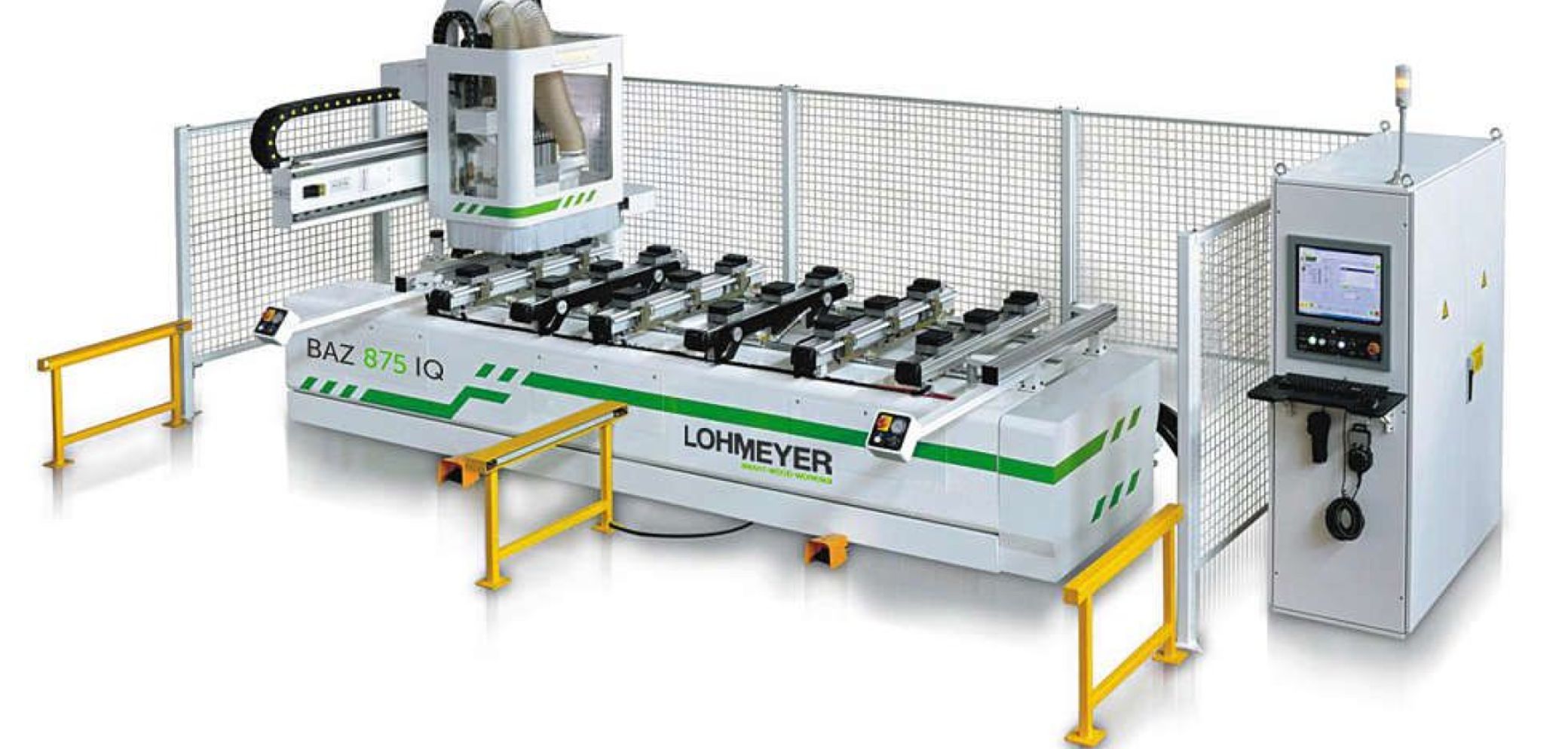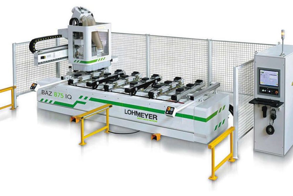 Mit dem CNC-Bearbeitungszentrum «BAZ 875 IQ» hat Lohmeyer auch eine 4-Achs-Maschine im Programm. Die Trennung von Bohrkopf und Frässpindel über zwei Z-Achsen garantiert umfassende Bearbeitungsmöglichkeiten und eine optimierte Absaugung. Der Bohrkopf mit 14 vertikalen und 8 horizontalen Spindeln sowie der integrierten Nutsäge erledigen die Bohrbearbeitung. Die 9-kW-Hauptspindel wird über einen in X-Richtung mitfahrenden Achtfach-Werkzeugwechsler bestückt.