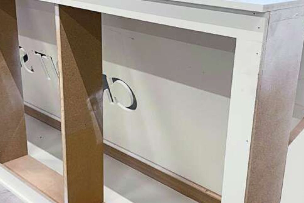 «Für Fronten kommt bei uns Multiplex zum Einsatz, es bietet einfach eine gute Flexibilität. Korpusse bauen wir aus Pappel-Sperrholz, welches wir kunstharzbeschichtet bestellen. Hier liegt der Vorteil bei der simplen Verarbeitung, dazu ist es einheimisches Holz. Lisocore wäre sicherlich vom Gewicht her attraktiv, dafür bräuchte es aber spezielles Einpresswerkzeug. Bei der Materialvielfalt beschränken wir uns auf eine gewisse Anzahl von Holzwerkstoffplatten», sagt Räss.