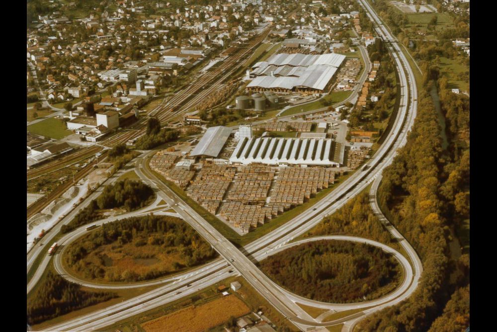Jahrzehntelang prägte das riesige Holzlager bei der Autobahnausfahrt St. Margrethen SG das Landschaftsbild. Bild Bauwerk Parkett AG