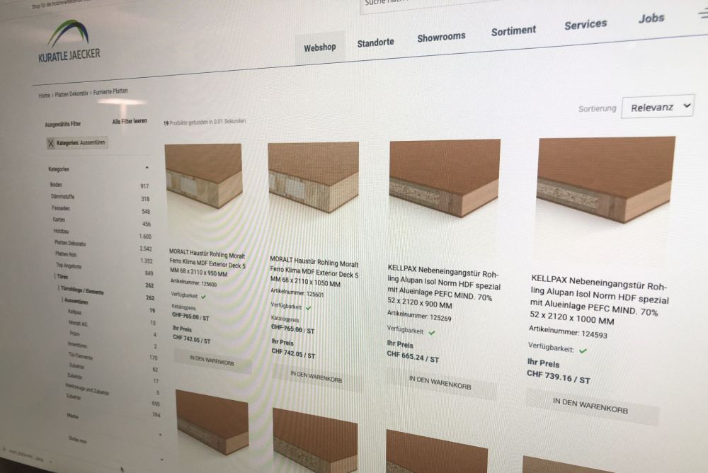 «7'904 Produkte gefunden in 0.01 Sekunden.» Diese beeindruckende Anzeige bekommt man zu sehen, wenn man sich durch den Webshop der Kuratle & Jaecker AG klickt. Das Holzhandelsunternehmen mit Sitz in Leibstadt AG bietet seit 1955 Holzwerkstoffe in allen Facetten an.