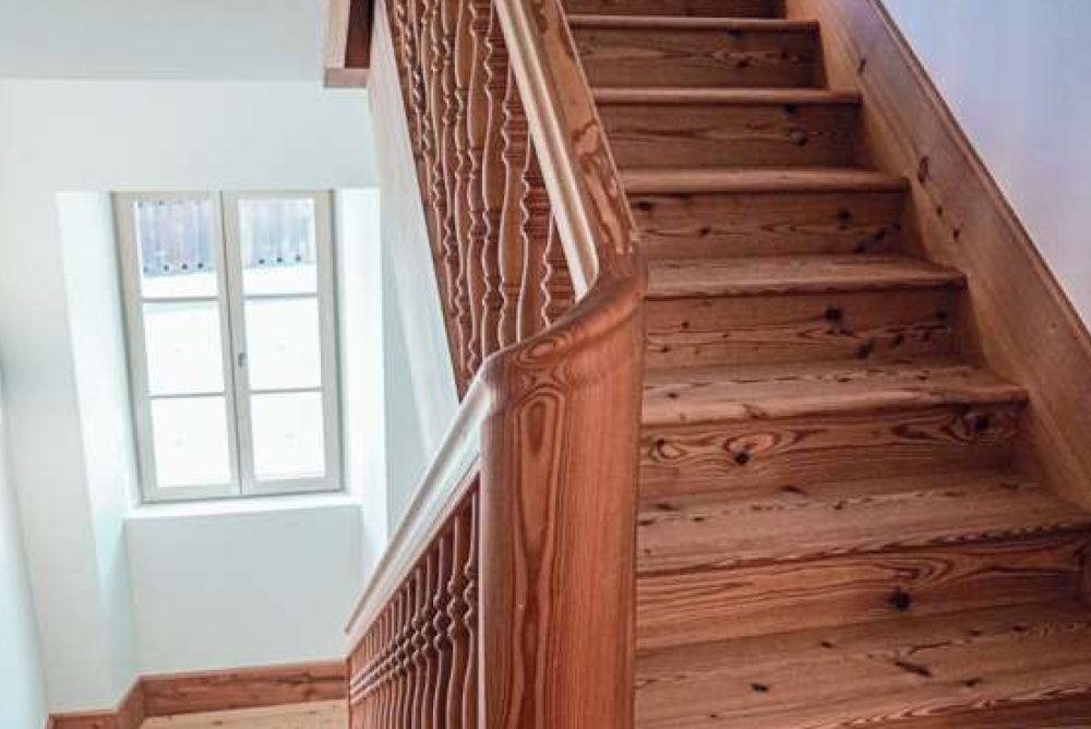 Die Zeit läuft weiter, auch wenn manches so bleiben soll, wie es immer schon war. Das Hotel Post in Andeer GR ist einer Totalsanierung unterzogen und der heutigen Zeit angepasst worden. Und doch soll das über 100 Jahre alte Gebäude seine Geschichte auch zeigen. Wie zur damaligen Zeit üblich, wurden die vier Etagen durch eine Holztreppe verbunden, was brandschutztechnisch für ein modernes Hotel nicht mehr zulässig ist. Dennoch bestand der Wunsch, wieder eine «gleiche» Treppe, aber aus gedämpfter Lärche, einzubauen – nur diesmal mit einem verpackten Betonkern. Tritt- und Setzstufen sowie die Wandwangen wurden als Auflagen durch den Parkettbetrieb Köstinger AG aus Felsberg GR ausgeführt. Die Treppenbaufirma CNC Holz Group SA aus Filisur GR erhielt den Auftrag, ein identisches Geländer mit Freiwangen herzustellen. Diese wurden aus furnierten, nicht brennbaren, mineralischen Vermipan-Feuerschutzplatten gefertigt. Alle anderen Teile sind aus Massivholz.