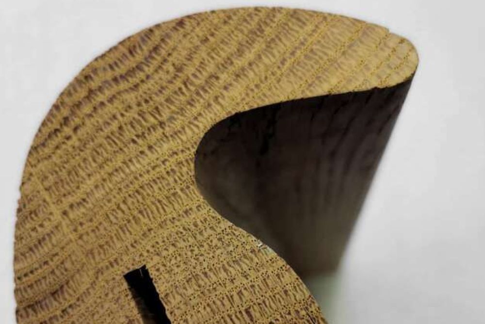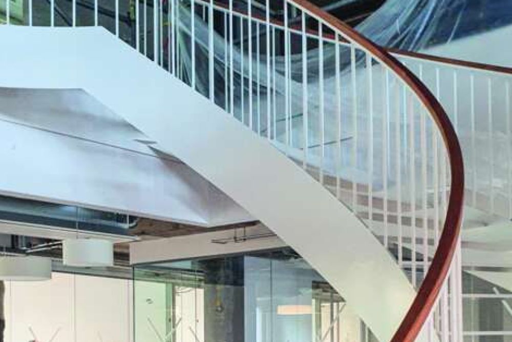 Als besondere Herausforderung galten die fünf Pfosten, die das Geländer auf den Treppenpodesten weiterführen. Sie gehen aus einem rechteckigen Querschnitt in den rund verlaufenden, omegaförmigen Handlauf mit perfekt durchlaufender Steigung über. Das erfordert auf der Aussen- wie auch auf der Innenseite des Pfostens jeweils entsprechend gefräste Rundungen, damit die Hand eines Benutzers auch auf dem Treppenpodest in der gleichen Haltung den Griff beibehalten kann, ohne die Finger anzuschlagen. Damit die Steigung sowie die Ausrichtung der oberen Handlauffläche in einem Fluss weiterlaufen können, muss die Kurve des inneren und des äusseren Handlaufprofiles jeweils eine leichte, aber unterschiedliche S-Form in der Steigung aufweisen.