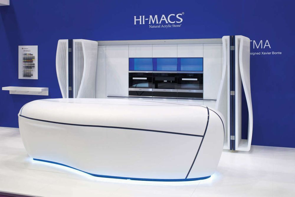 Eintauchen in die «Hi-Macs»-Welt und die Einsatzmöglichkeiten dieses Acrylsteins entdecken: Das bietet die Kläusler Acrylstein AG an ihrem Stand. Neben einer ausführlichen Materialberatung werden auch gleich die richtige Pflege und Reinigung vorgeführt. Als Highlight wird eine verblüffende, futuristische Küche gezeigt, welche der Belgier Xavier Bonte mithilfe dieses sehr flexibel einsetzbaren Acrylsteins gestaltet hat. Das Kernstück der Inselküche ist ein weisses Element, dessen Form an eine Wolke erinnert. Die prägnanten, blauen Linien darauf sind in Farbumkehrung den Kondensstreifen eines Flugzeugs nachempfunden. Auf der schwungvoll gewölbten Vorderseite befinden sich vier grifflose Schubladen, und beim Öffnen der Abdeckung per Fernbedienung erscheint ein voll funktionsfähiger Arbeitsbereich inklusive Kochfeld mit Filterabzugshaube, zwei Spülbecken und Wasserhahn. Dieser taucht während des Öffnungsvorgangs auf. Die Präsentation bietet einen Blick in eine Zukunft mit neuen gestalterischen Möglichkeiten.