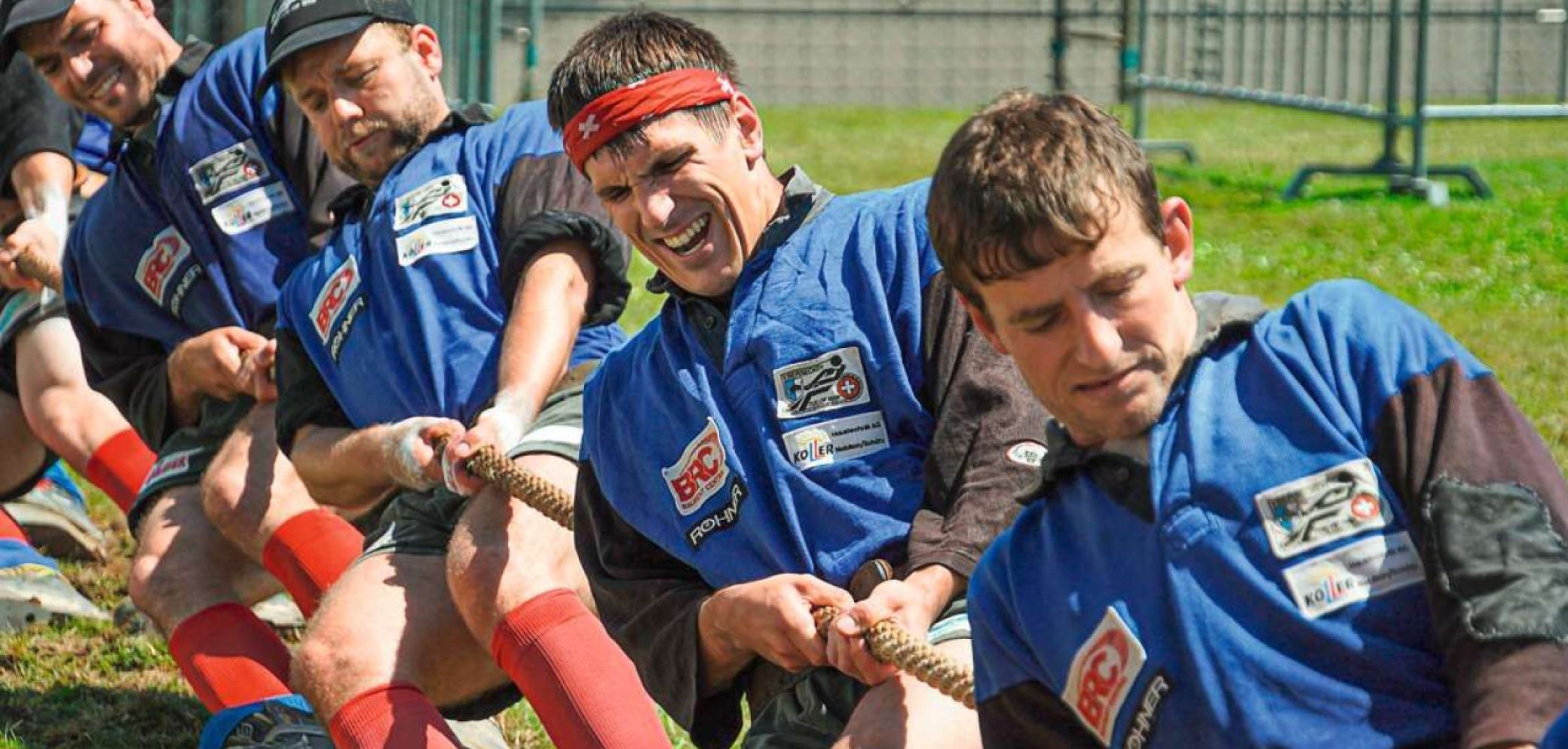 Im Seilziehen ist es wie im echten Leben: Wenn alle an einem Strick ziehen, dann kann man Grosses erreichen, das hat Fabian Rölli (30, zweiter von rechts) mehrfach selbst erlebt. Bild: Stephanie Arnet